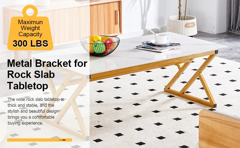 • Polished, modern look—white marble-like sintered stone top with a warm gold metal frame for an elevated living-room focal point.