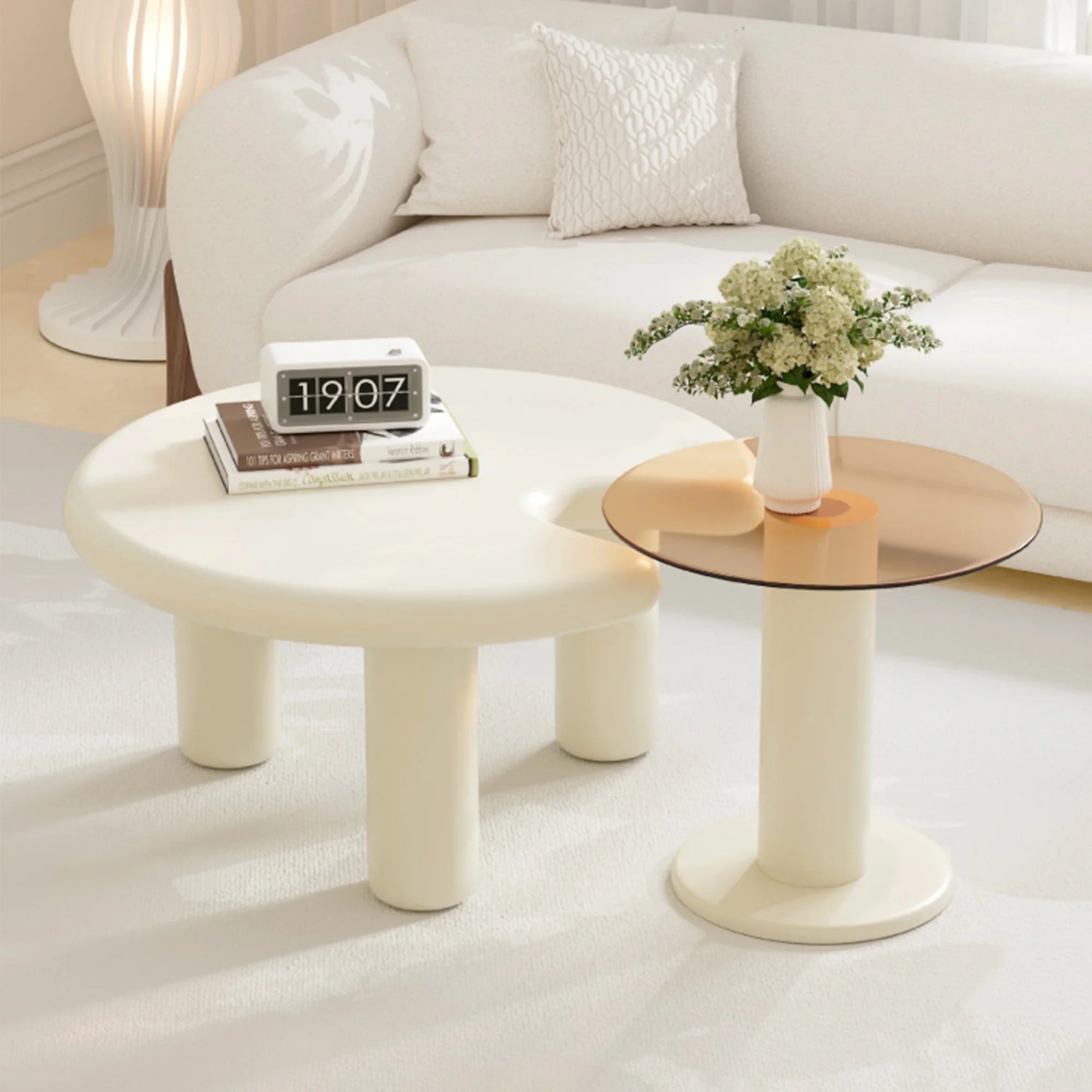 Designed for modern living rooms and compact apartments, this Nesting Coffee Tables set brings sculptural form and everyday function to your primary living space. The low-profile round coffee table pairs a solid beige MDF base with a smaller side table topped in amber-tinted glass, creating a layered, gallery-ready vignette that complements neutral, Scandinavian, and contemporary interiors.