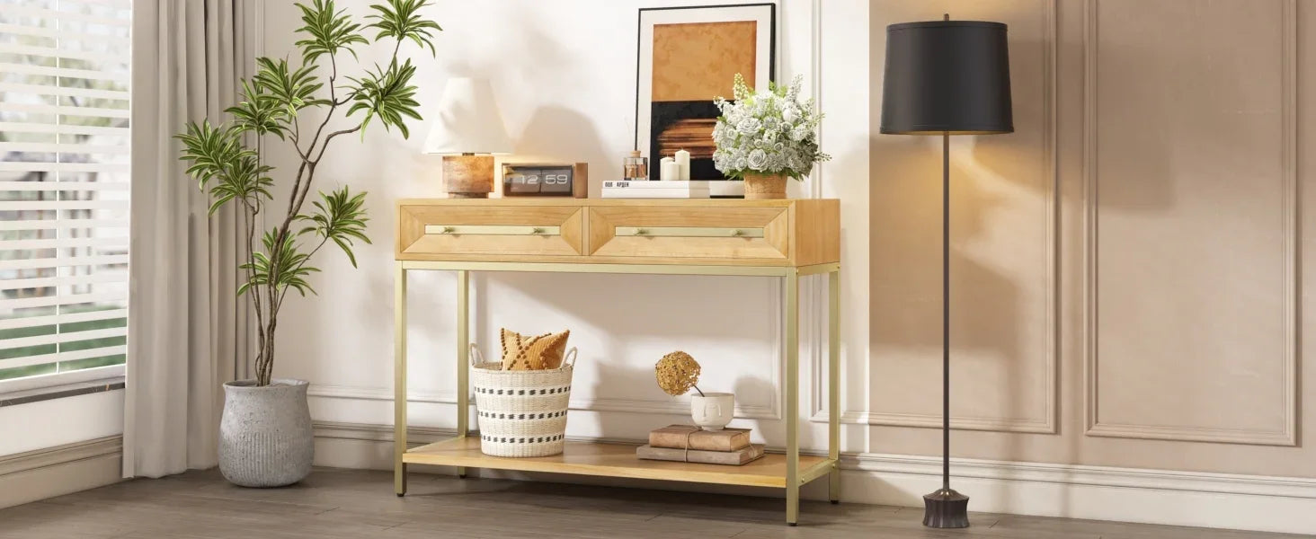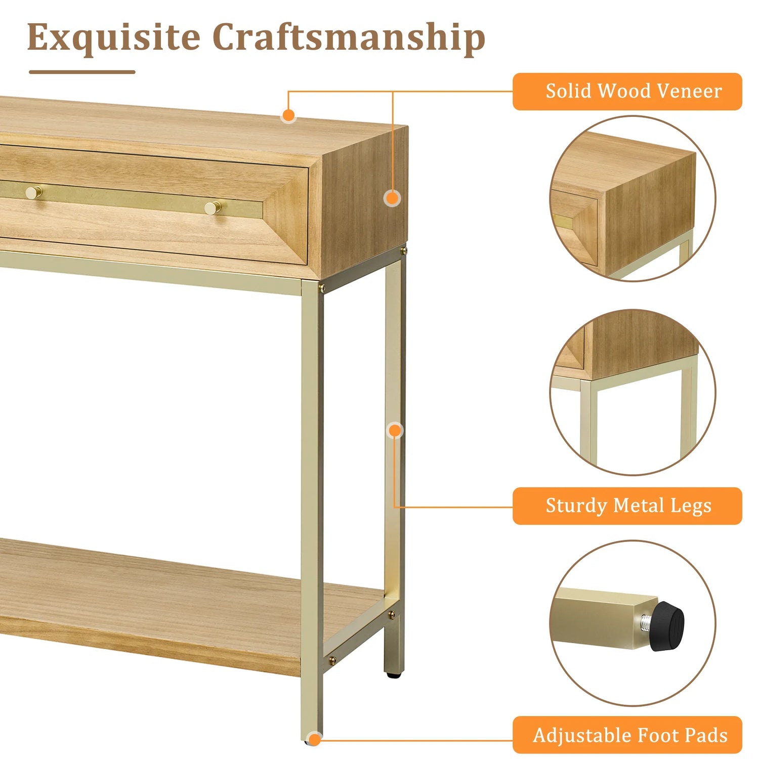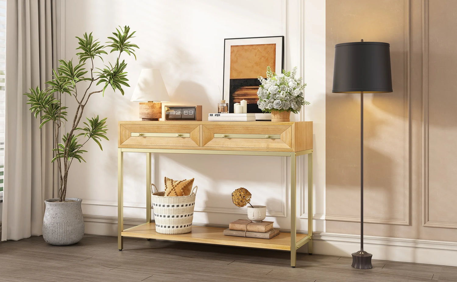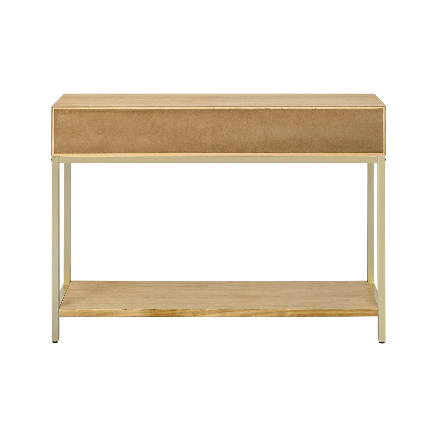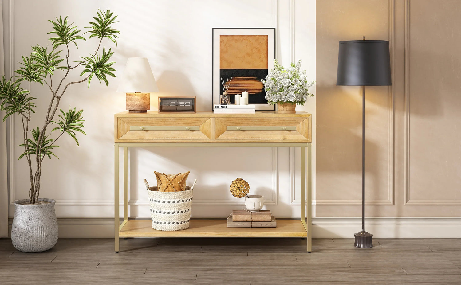 Use it to corral mail, keys and chargers, stage a lamp and art, or add seasonal styling — the two smooth-front drawers hide clutter while the lower shelf gives room for baskets or shoes. Built with an MDF top and a slender metal base finished in a warm, gold-tone, the table blends a natural wood look with metallic accents for a contemporary yet timeless silhouette.