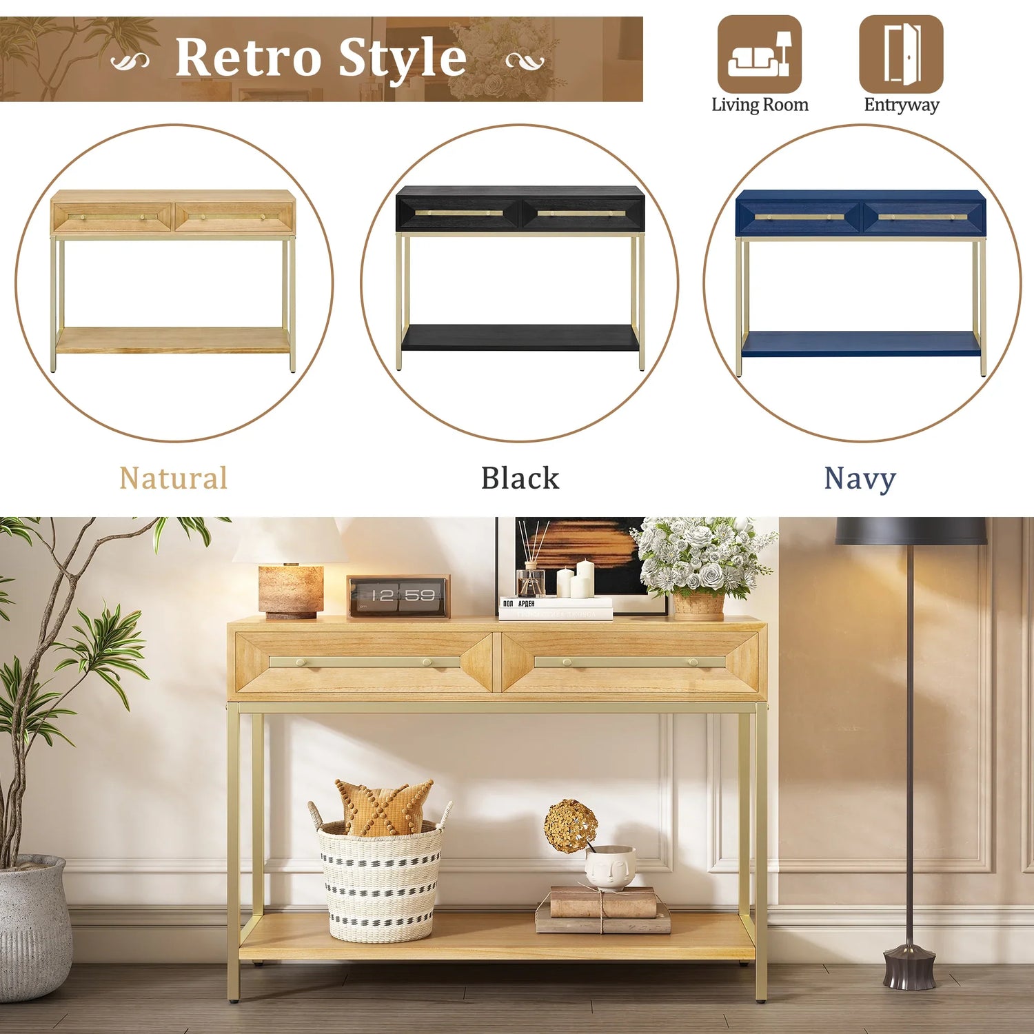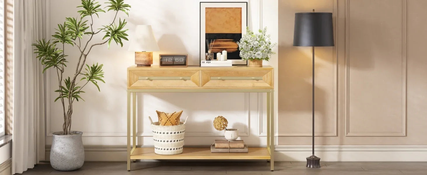 Perfect for a narrow entryway, behind a sofa, or as a hallway accent, this Console Table with Two Drawers — Geometric Design in Natural brings tailored style and everyday storage to small-to-medium spaces. Designed for people who want clean, modern-retro lines plus practical surface and hidden storage, it pairs sculpted drawer fronts and a slim metal frame to create a refined focal point without taking up floor space.