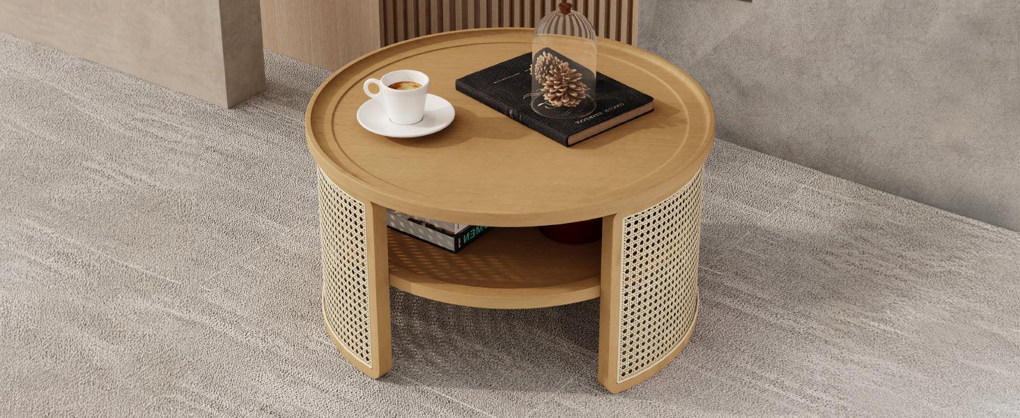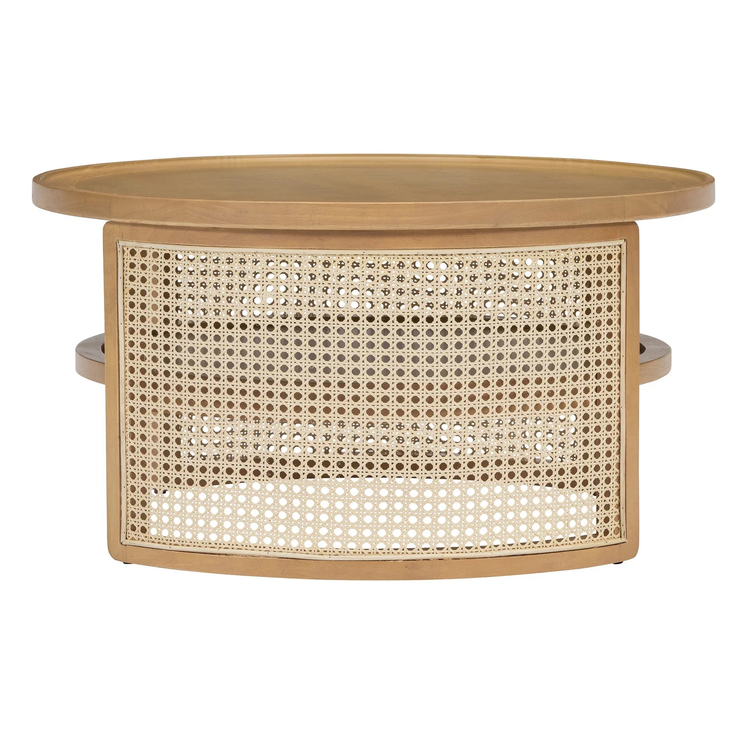 Perfect for anyone looking to add warm, natural texture to a living room, den, or sunroom, this round coffee table with storage pairs the clean lines of modern design with relaxed, boho-inspired details. The low-profile, circular top creates a casual gathering point for coffee, books, and décor while the caned sides keep the silhouette light and airy—ideal for smaller spaces or a layered, natural aesthetic.