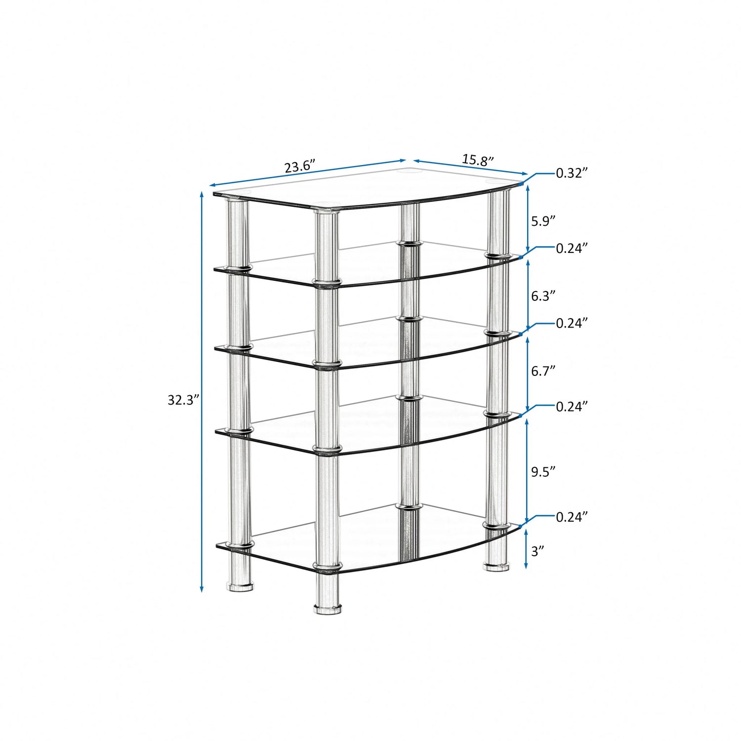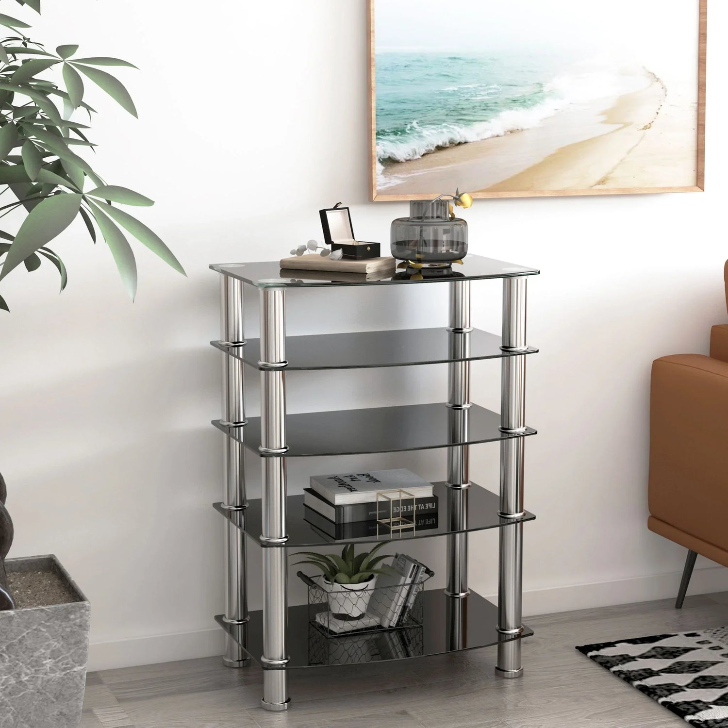 Clean-lined and compact, this 5-tier tempered glass side table is for shoppers who want modern storage and display without visual clutter. It fits beside a sofa, next to a bed, or tucked into a hallway—providing five open shelves for books, media components, decorative objects or bedside essentials while keeping the room feeling light thanks to clear, smoked glass surfaces and a slim stainless steel frame.