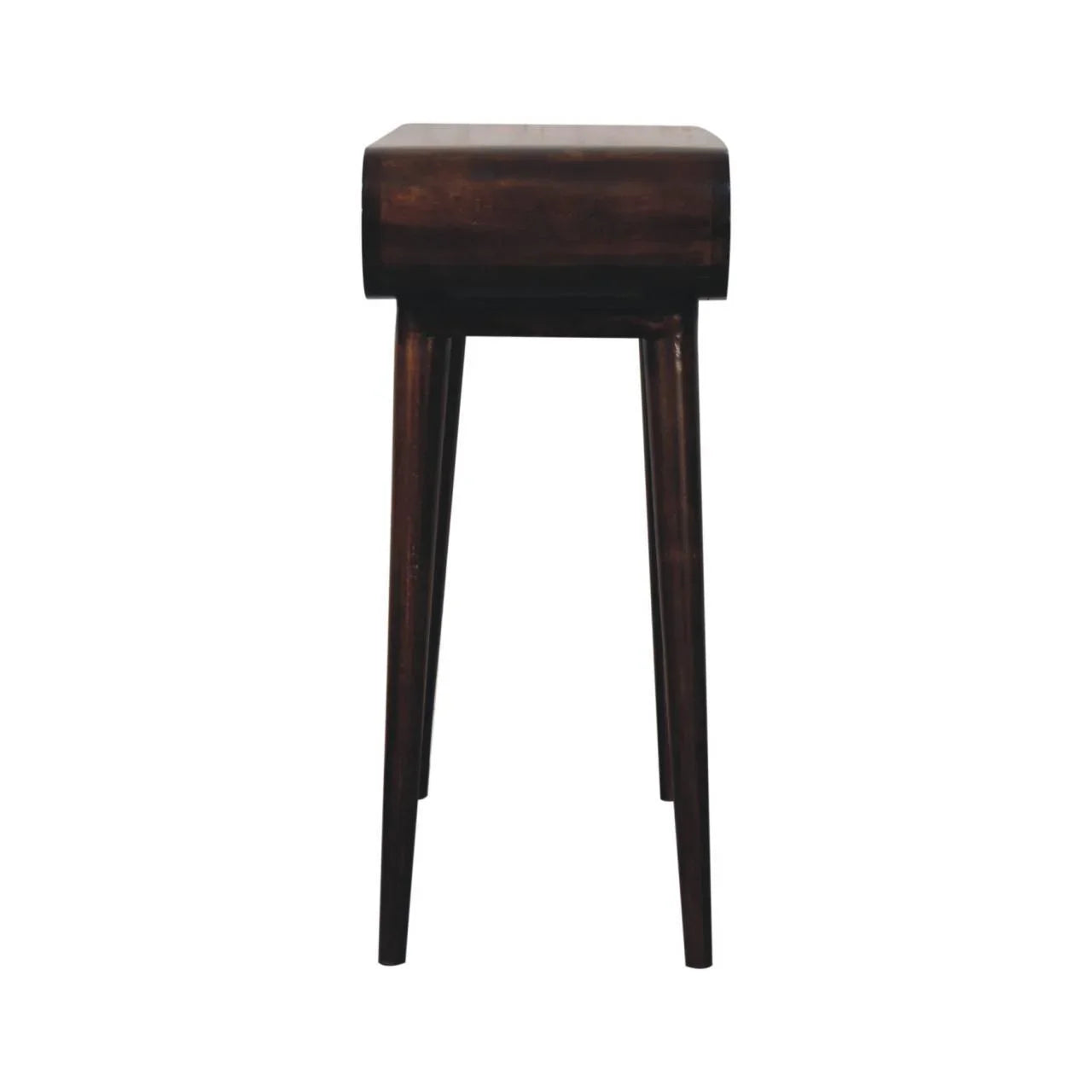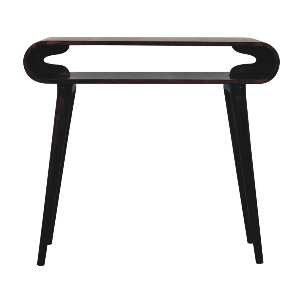 Day-to-day the open, rounded shelf creates a neat display nook while the slim, tapered legs keep the silhouette light and airy. Handcrafted from solid wood with complementary filler wood accents and a warm walnut finish, the table reads both contemporary and timeless—an easy layering piece for modern, mid-century, or transitional interiors. Note: natural wood grain and finish will vary slightly by piece and screen.