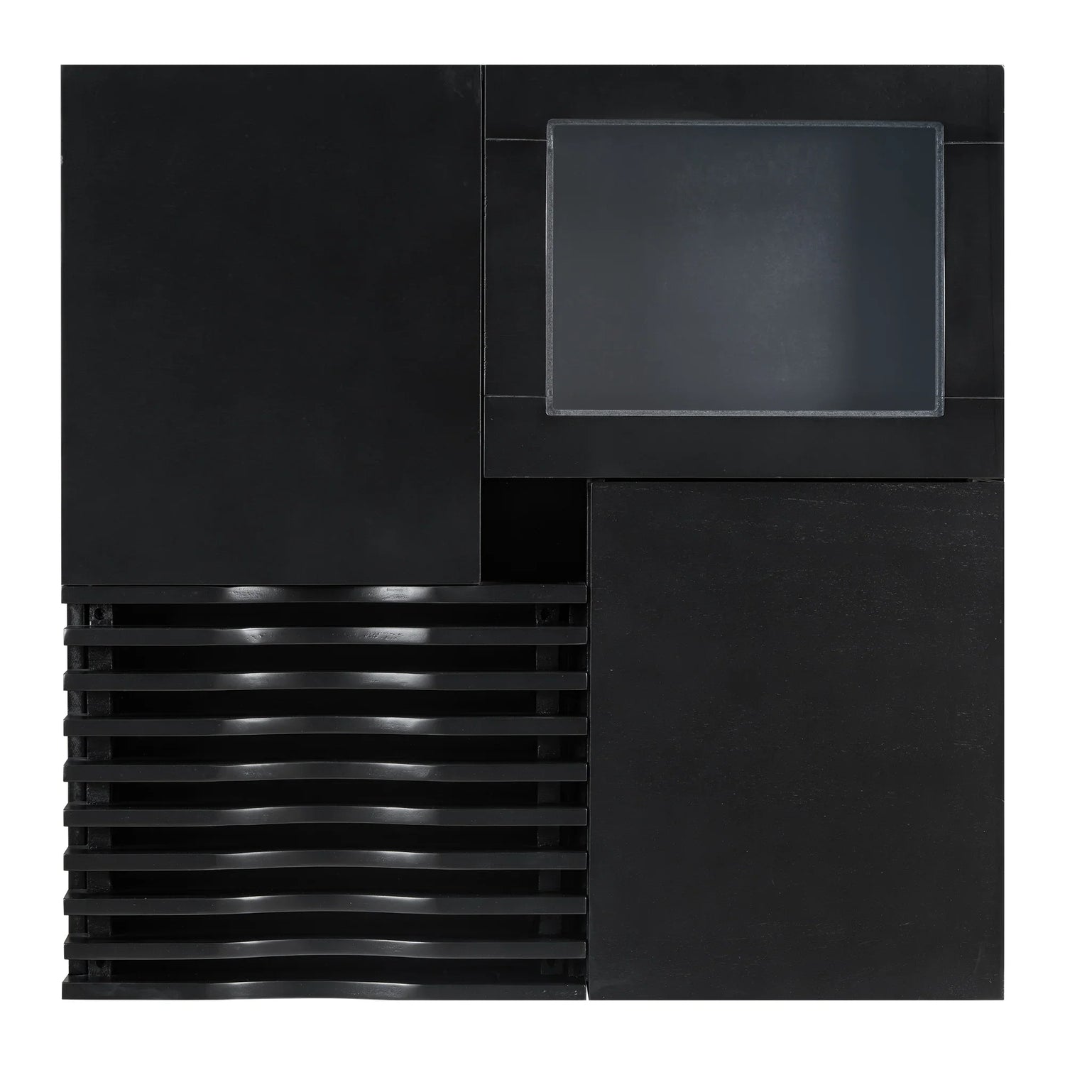 - Finish & color: black with a low-sheen/veneer appearance; natural wood accents on legs. Screens and natural materials may show slight variation.