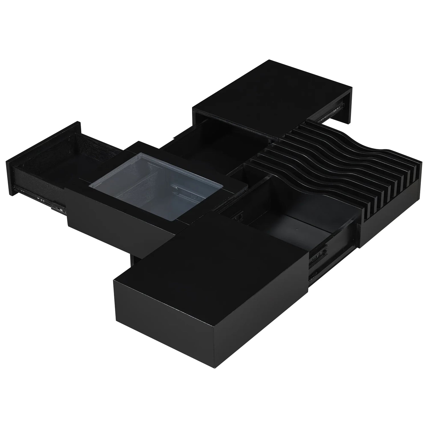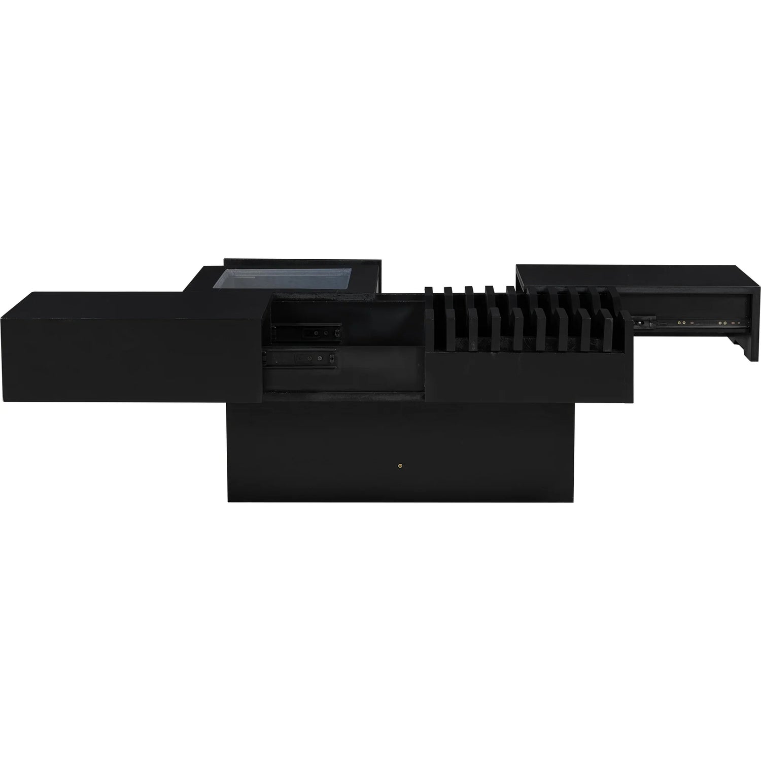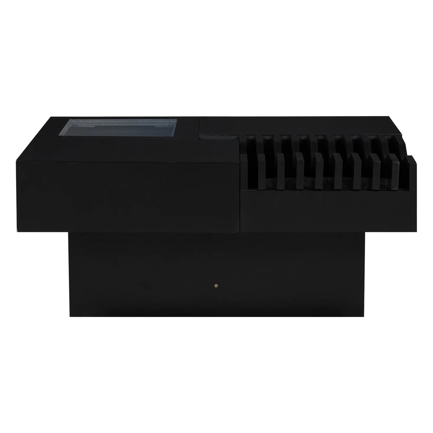 Use it as a multifunctional center table for coffee, books and decor—the slotted, wave-like surface doubles as a display tray while a tempered glass viewing window reveals hidden storage below. Constructed from solid wood, MDF and glass, the table pairs mid-century geometry with practical storage for remotes, magazines and small accessories for day-to-day living.