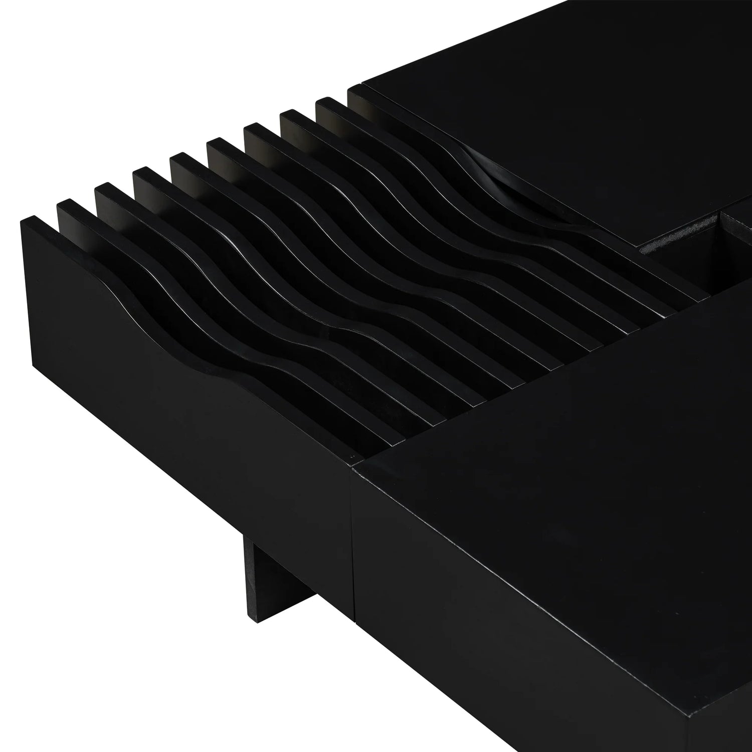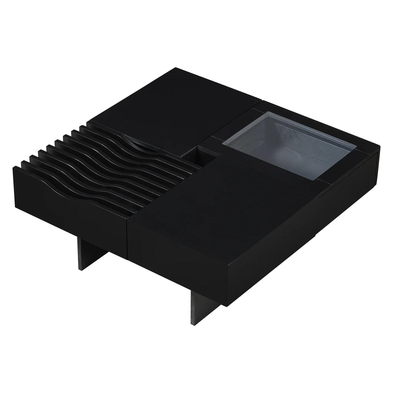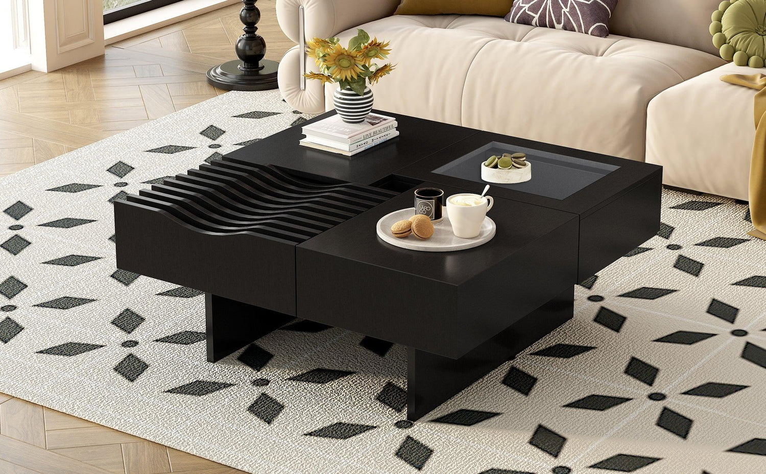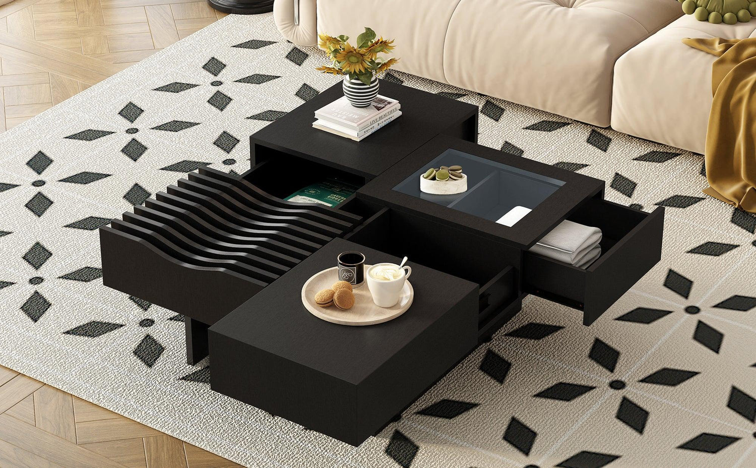 Use it as a multifunctional center table for coffee, books and decor—the slotted, wave-like surface doubles as a display tray while a tempered glass viewing window reveals hidden storage below. Constructed from solid wood, MDF and glass, the table pairs mid-century geometry with practical storage for remotes, magazines and small accessories for day-to-day living.