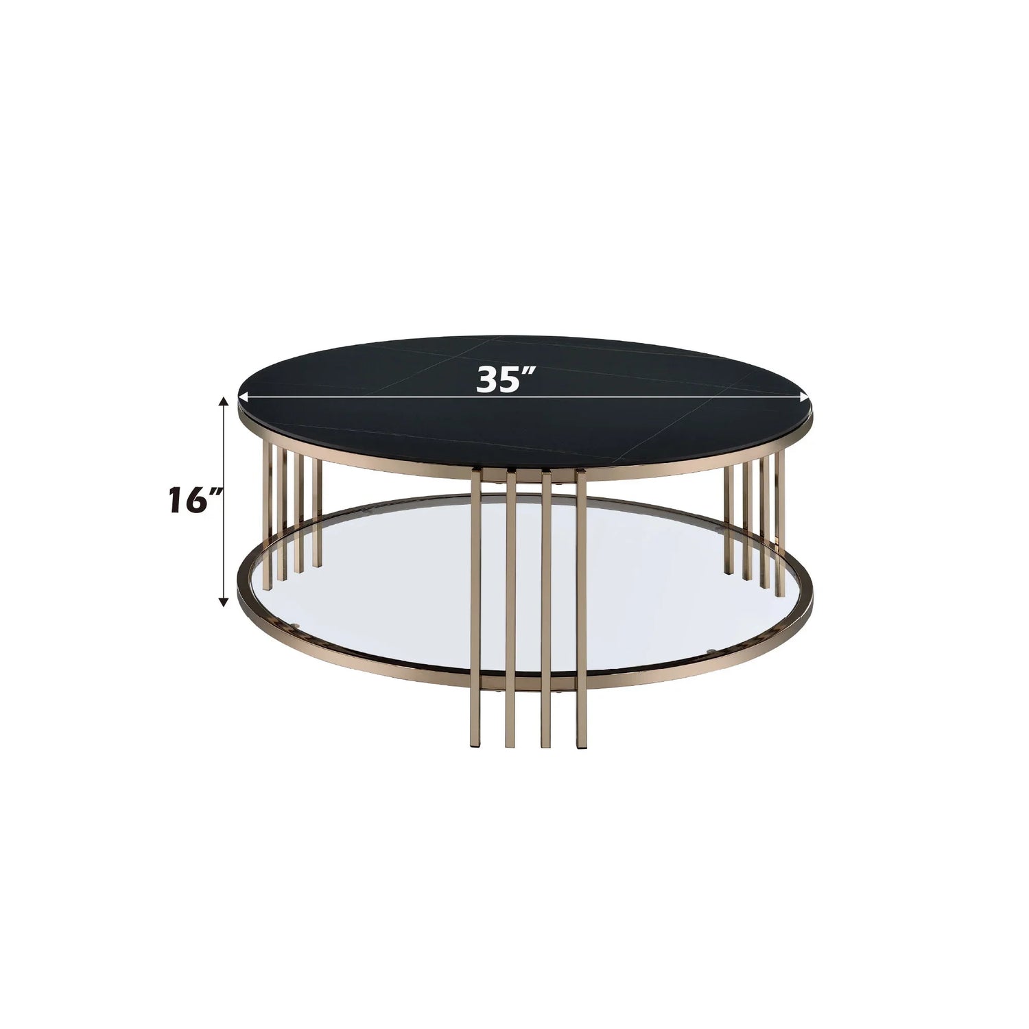Perfect for modern living rooms and elevated lounge areas, the Abisha Sintered Stone Top Round Table blends resilient materials with refined hotel-style details. Its round sintered stone surface creates a chic centerpiece for coffee-table styling, while the slim, champagne-finished metal frame keeps the look light and architectural—ideal for homes that want a statement piece without feeling heavy.
