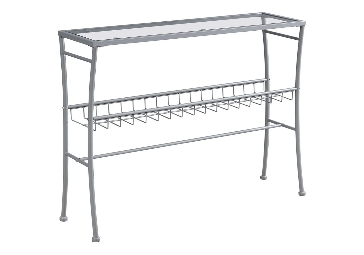 Built around a slim metal frame finished in pearl silver, the design pairs a clear glass rectangular top with a strong lower wire metal shelf for extra storage. The result is a modern, contemporary piece that reads minimal and airy while giving you purposeful surface area and accessible organization where guests arrive.