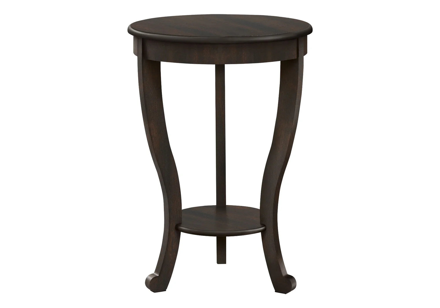 This compact, traditionally styled 2-tier accent end table is for anyone who wants a graceful, functional surface next to a sofa, armchair, or entryway. With a round top and a small lower shelf, it works as a living-room end table, lamp table, or an elegant catchall in a hallway — especially where floor space is limited but style still matters. The dark walnut brown veneer and subtle wood grain bring warm, classic character without overpowering a room’s decor.