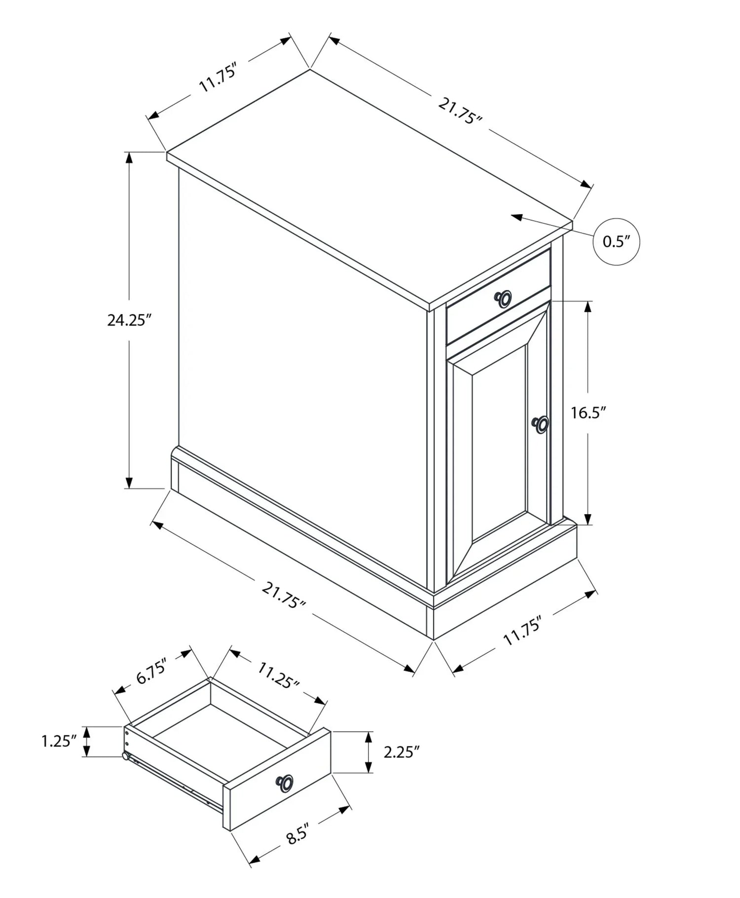 - Storage: One top drawer with round metal knob; one lower cabinet with framed door and matching metal knob.
