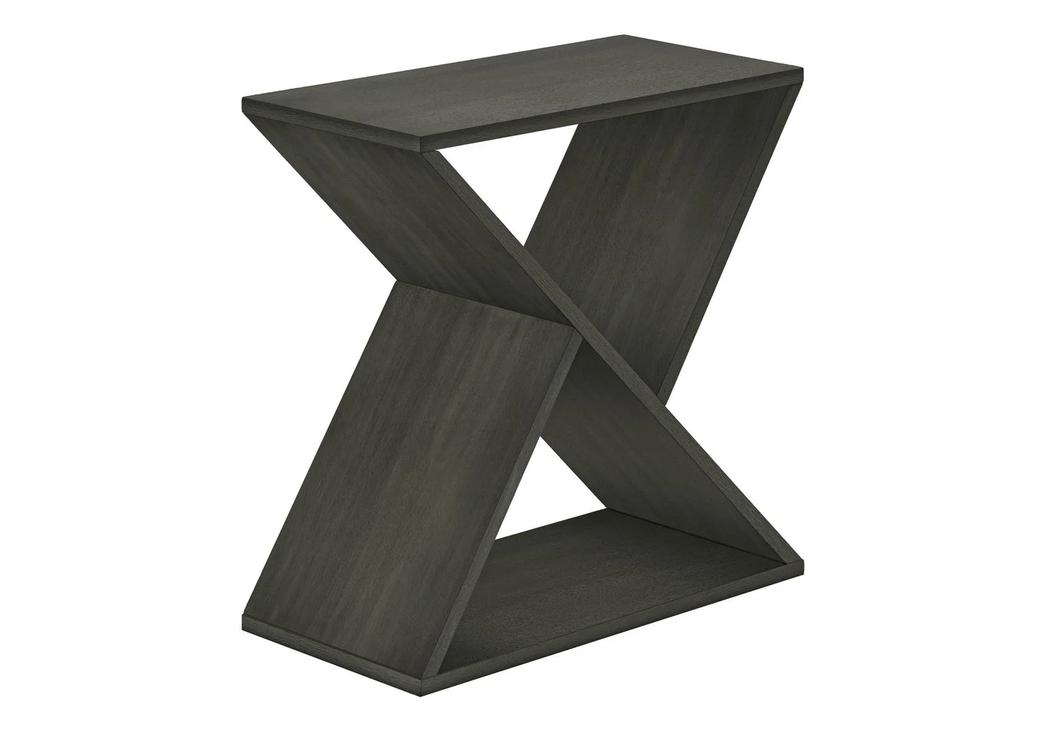Design: Contemporary X-profile side table with integrated angled shelf space and rectangular top surface.
