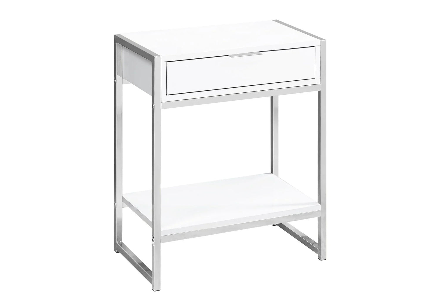 Construction: Solid metal frame with a finished tabletop and a single storage drawer featuring a discreet metal drawer pull. Open lower shelf for display or storage.
