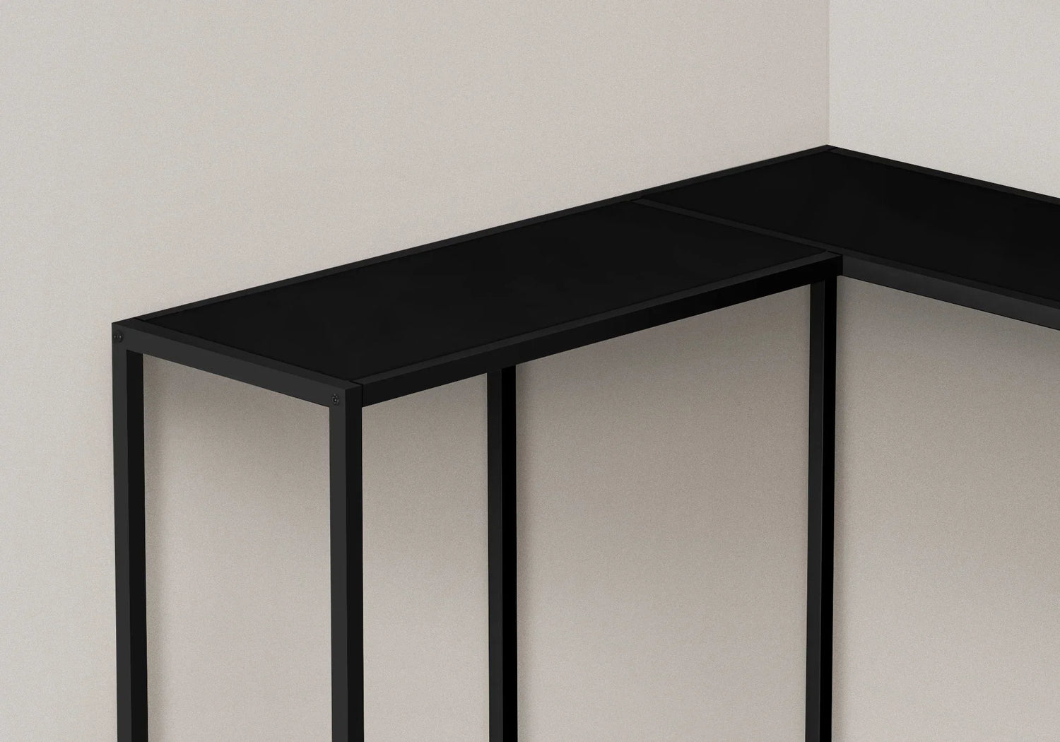 This streamlined L-shaped console is made for entryways, small living rooms, or tight hall corners where you want display impact without bulk. Clean, contemporary lines and an all‑black finish give it a modern gallery look—ideal for a pair of lamps, a stack of books, or seasonal accents that welcome guests without taking up floor space.