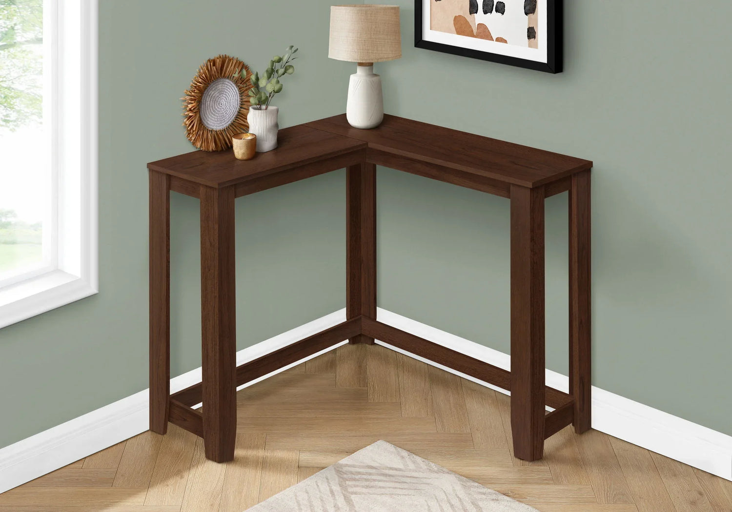 A smart solution for tight entryways and angled corners, this Corner Accent Console Table brings clean, modern lines to small-space living. Designed for someone who wants a purposeful landing spot for keys, mail, and a lamp without sacrificing style, it tucks neatly into a corner to make the most of unused square footage while keeping surfaces organized.