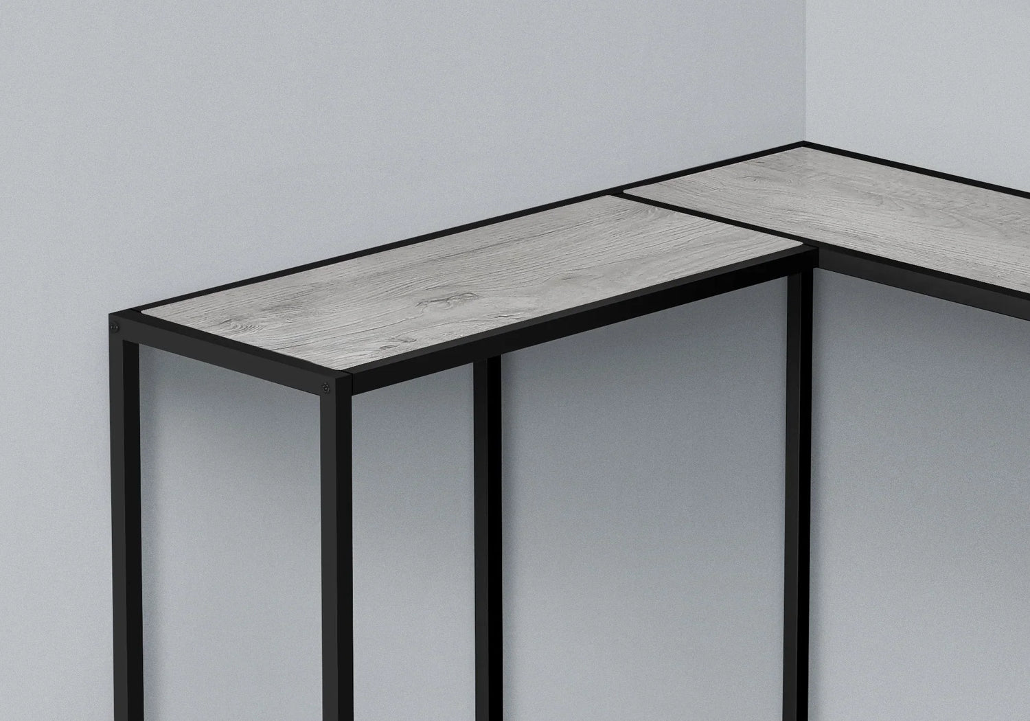 Crafted with a slim black metal frame and warm, light-brown wood-look tabletops, the design balances industrial structure with natural texture for an easy-to-style, contemporary look. The open, airy base keeps sightlines clear and the footprint feeling light, while the rectangular panels provide stable, usable display space for everyday essentials and curated accents.