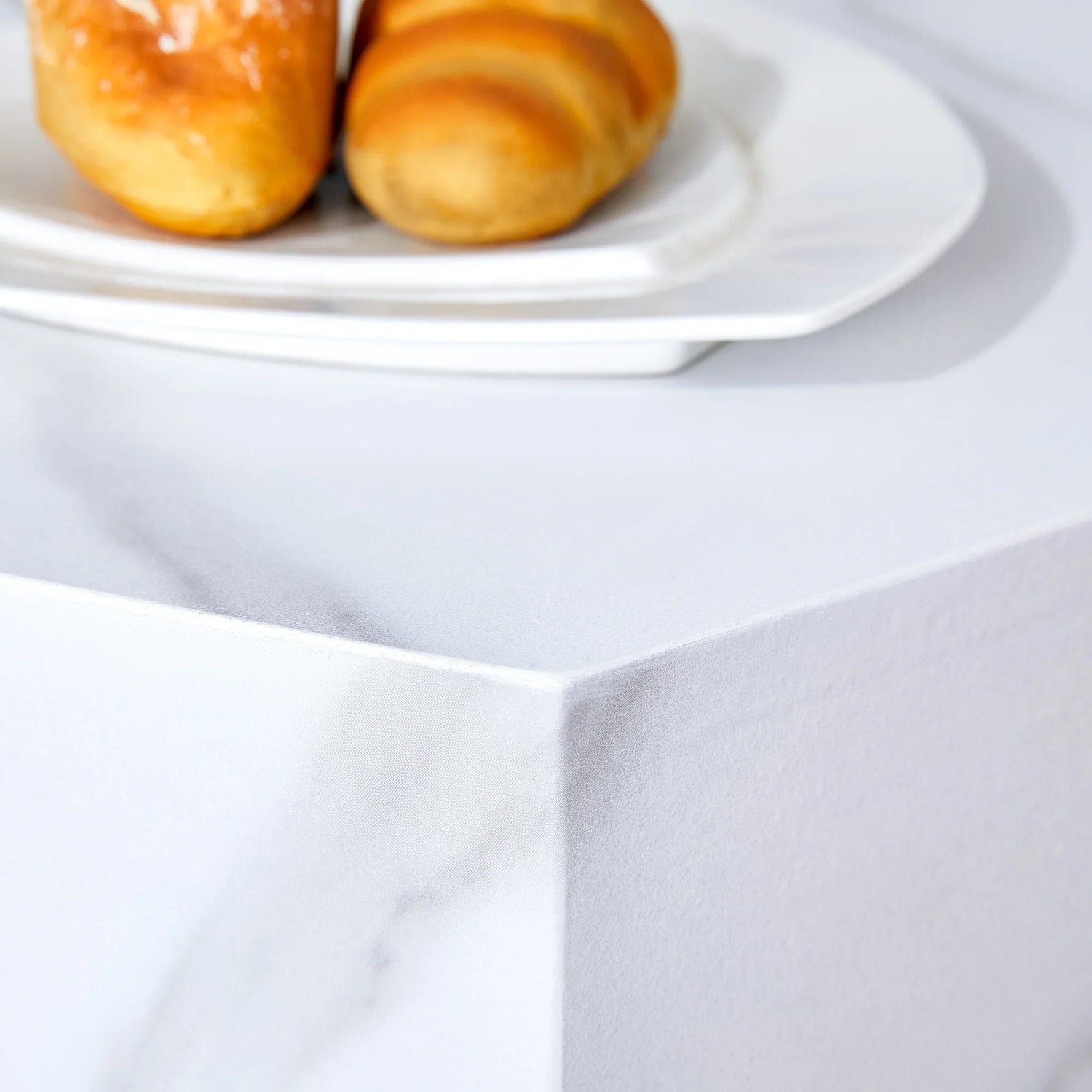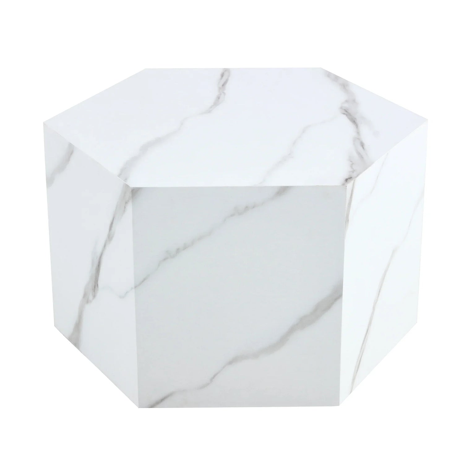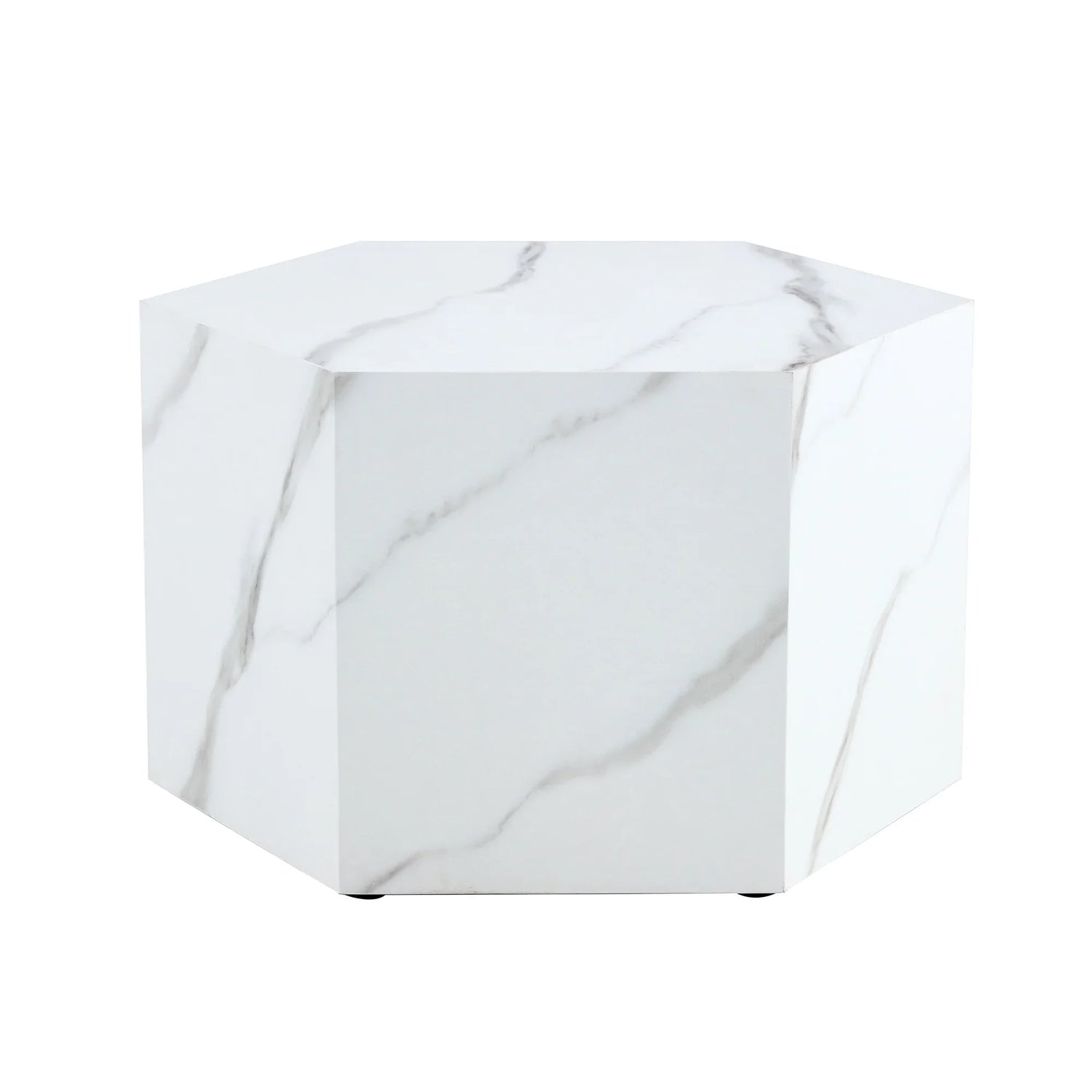 Clean, sculptural and quietly modern — this geometric coffee table is made for compact living rooms, studio apartments, and contemporary lounges that need a bold focal point without fuss. Its hexagonal cube silhouette and white marble-effect surface read like carved stone while remaining lightweight and easy to place beside a sofa or between two lounge chairs. The low profile works well in conversation groupings and keeps sightlines open in smaller spaces.