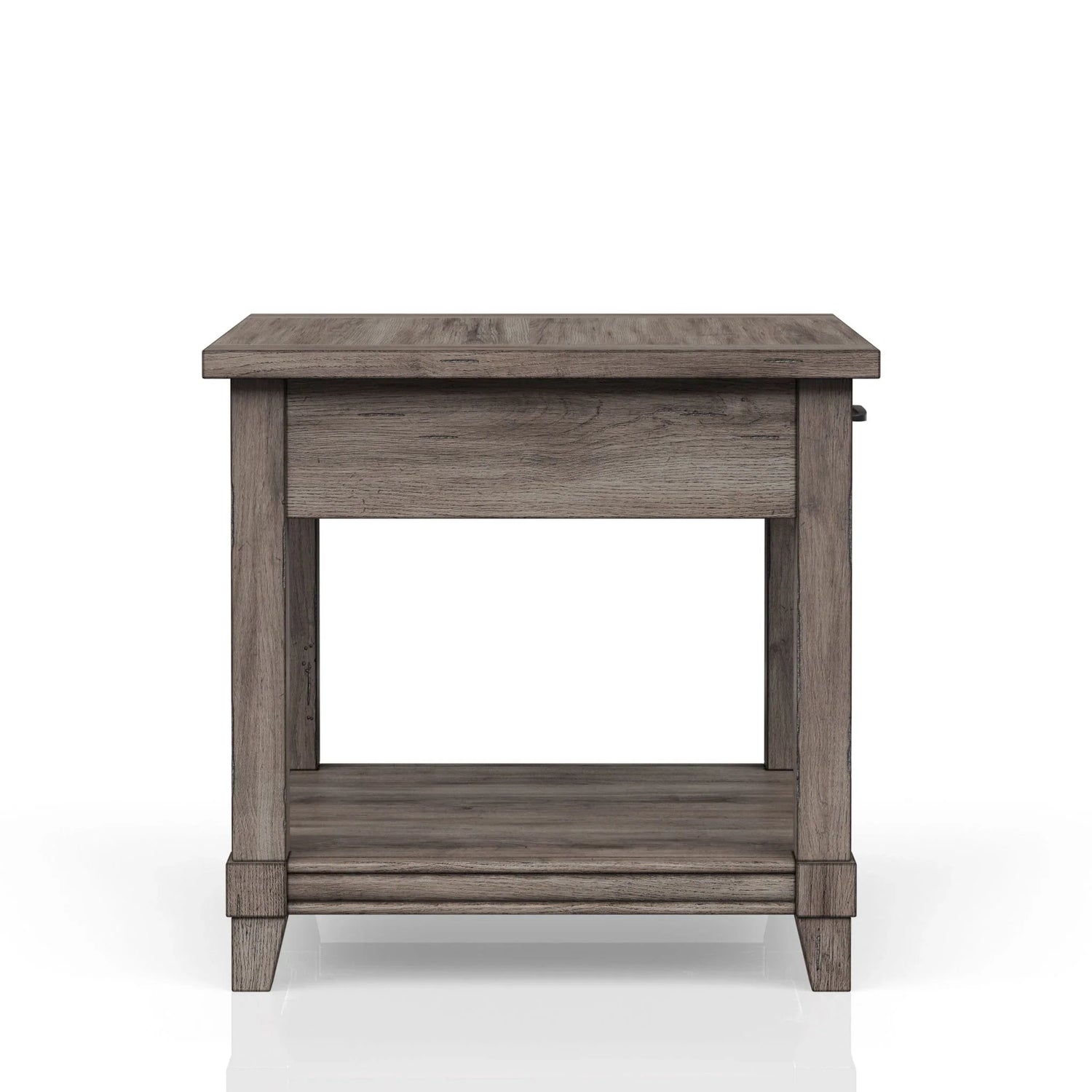 A compact living-room companion for bedside, sofa-side, or a cozy reading nook—this rustic gray end table is designed for people who want practical storage and modern convenience without sacrificing warm, lived-in style. The clean square top, single storage drawer and open lower shelf make it easy to keep remotes, reading glasses and a favorite book within reach while retaining a neat surface for a lamp or mug.