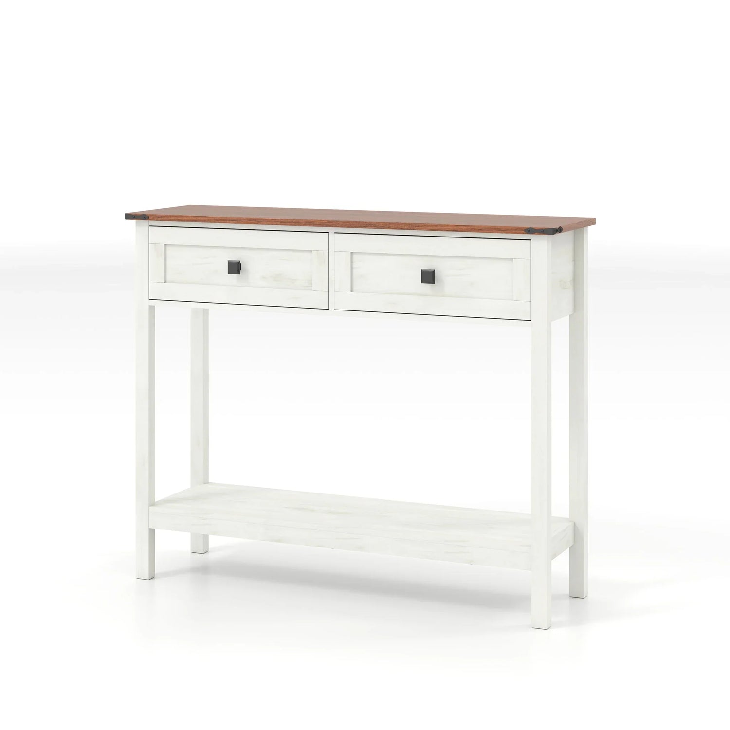 Perfect for entryways, narrow hallways, or behind a sofa, this farmhouse-style console table balances everyday function with relaxed, rustic charm. The dual-tone top and base create a warm contrast—an antique white body paired with a rich brown woodgrain top—so it blends easily with cottage, transitional, or modern farmhouse interiors. Two shallow drawers keep keys and small essentials tucked away while the open lower shelf holds baskets, shoes, or decorative accents.
