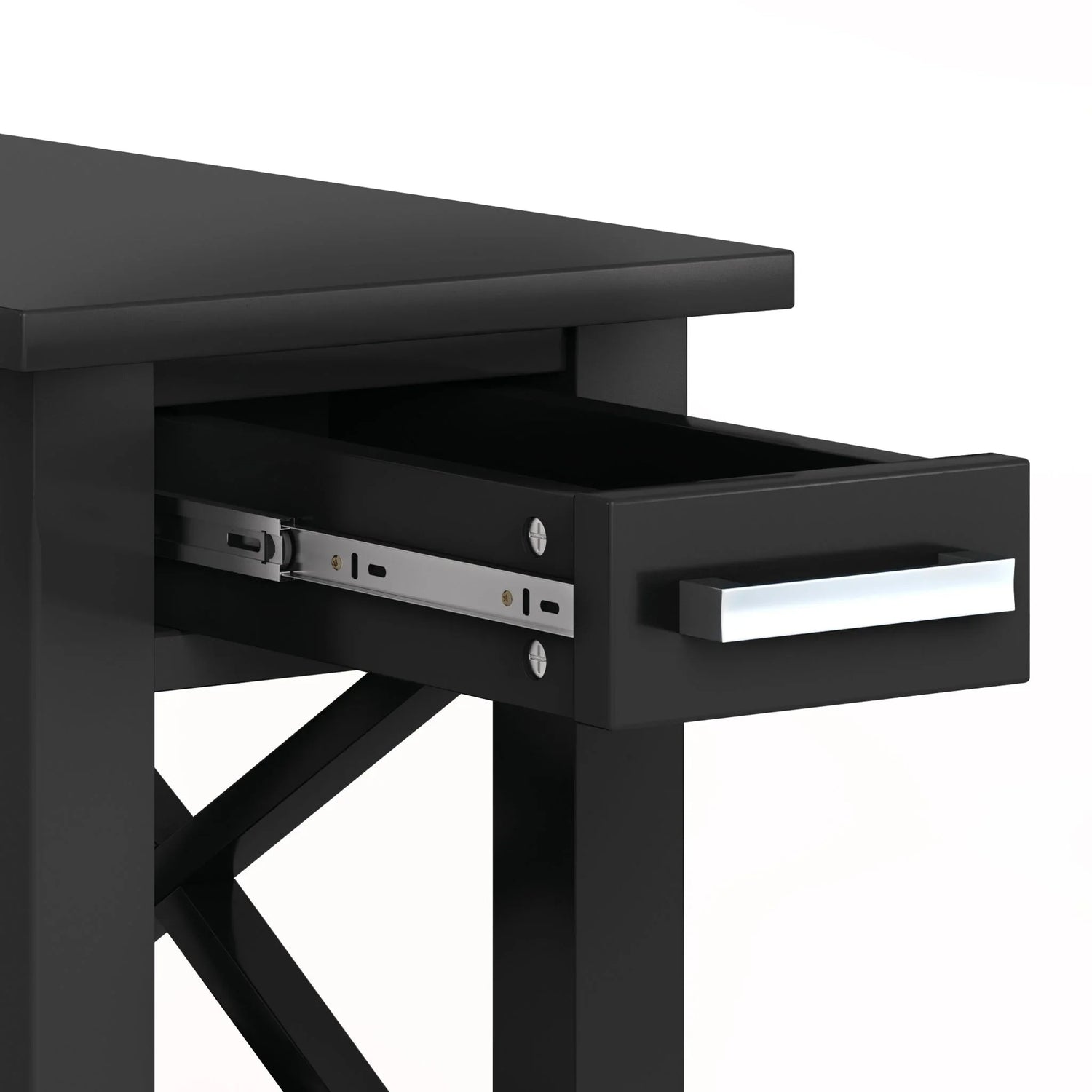Handcrafted from solid wood with a warm, weathered finish and a clean X‑frame detail on the sides, this table pairs the look of classic carpentry with modern hardware—brushed nickel pulls and smooth metal drawer glides—for reliable function. An open lower shelf increases usable storage while the single drawer keeps essentials within reach.