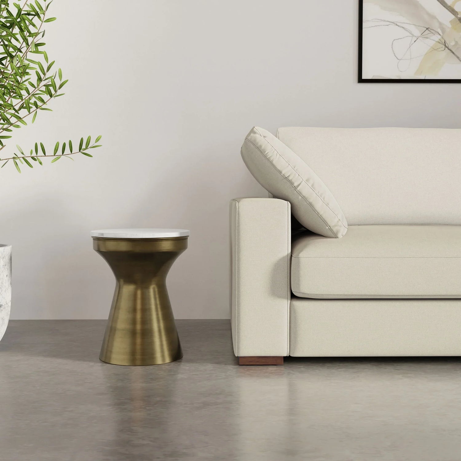 Finish & Color: Antique brass base with a warm gold undertone; white marble top with natural veining. Note: natural materials and screen settings may cause slight color variation.