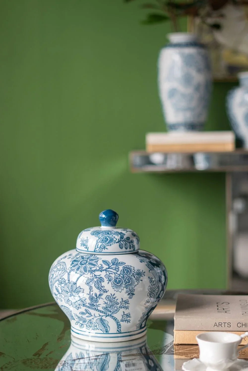Pair with a textured area rug and a sculptural lamp to play up the table’s reflective quality. Display a small stack of coffee-table books and a low floral arrangement to complement the top’s botanical motif without obscuring it. Works especially well with warm metallic accents and soft neutrals for an elevated, layered look.