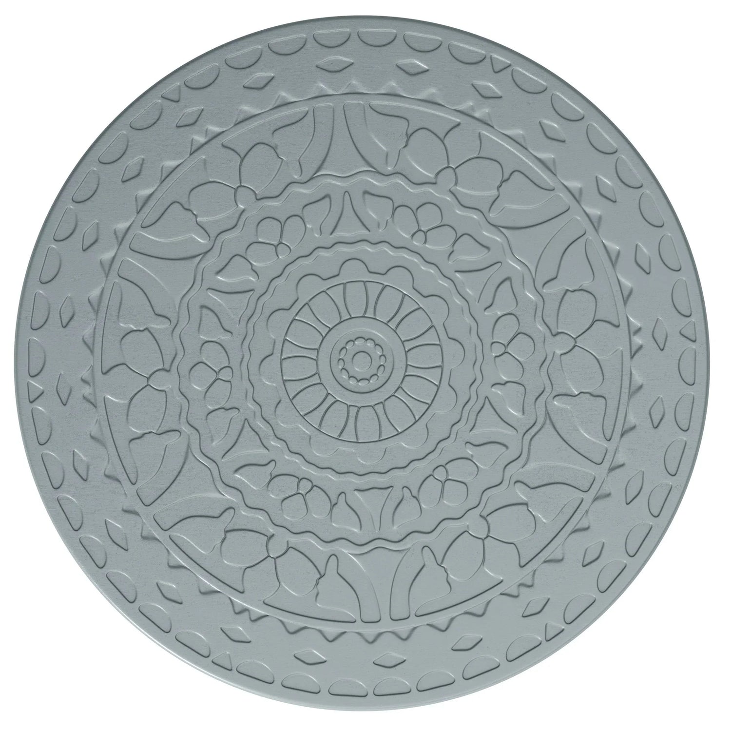 Built from solid mango hardwood with a hand‑finished gray stain and supported by black metal tapered legs, this piece balances artisan woodworking with clean, modern lines. The intricately carved circular top adds subtle texture and visual interest while remaining low-profile and easy to style—sold individually and finished to show natural wood character that may vary from piece to piece.