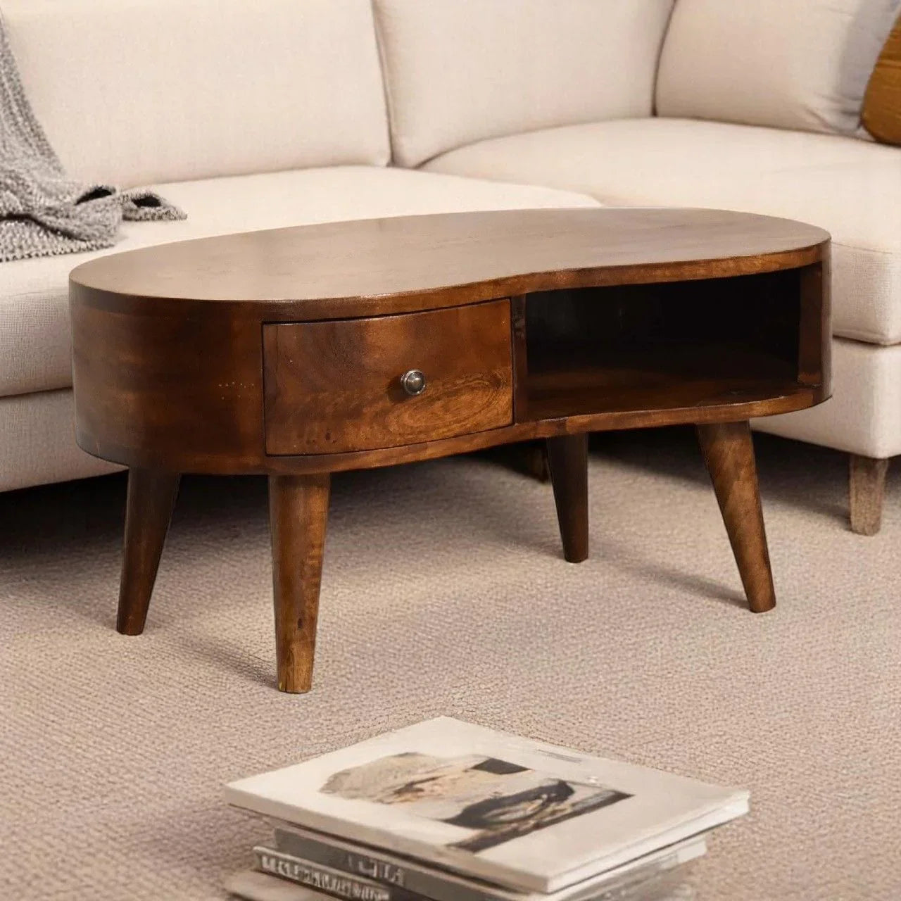 - Artisan Furniture Solid Wood Large Wave Coffee Table - This solid wood coffee table has been constructed from 100% solid mango wood in a finish and offers a unique shaped design with rounded edges. It features one open slot and one drawer with a shiny knob and Nordic-style legs. A great simple and add to the bedroom.