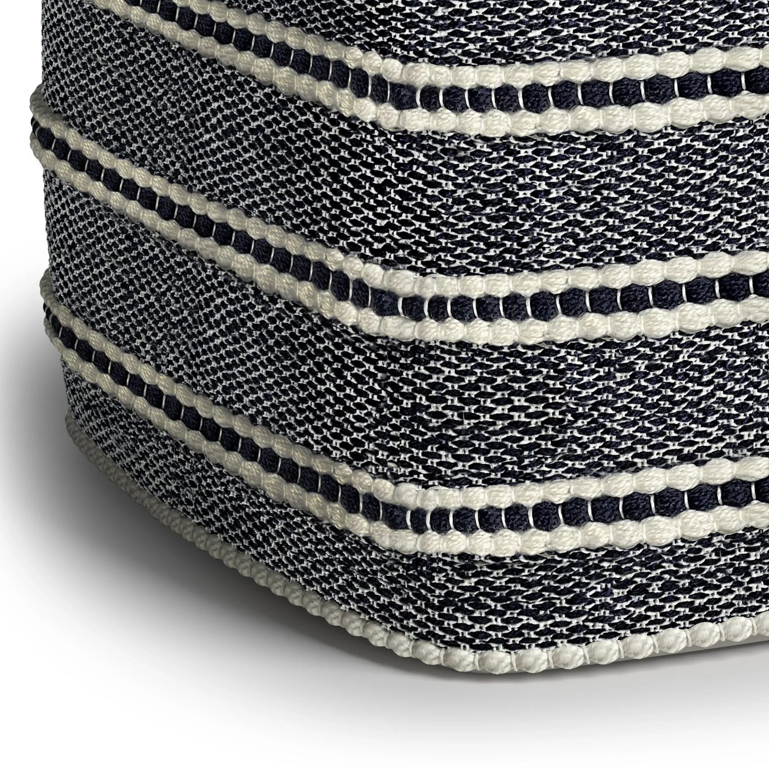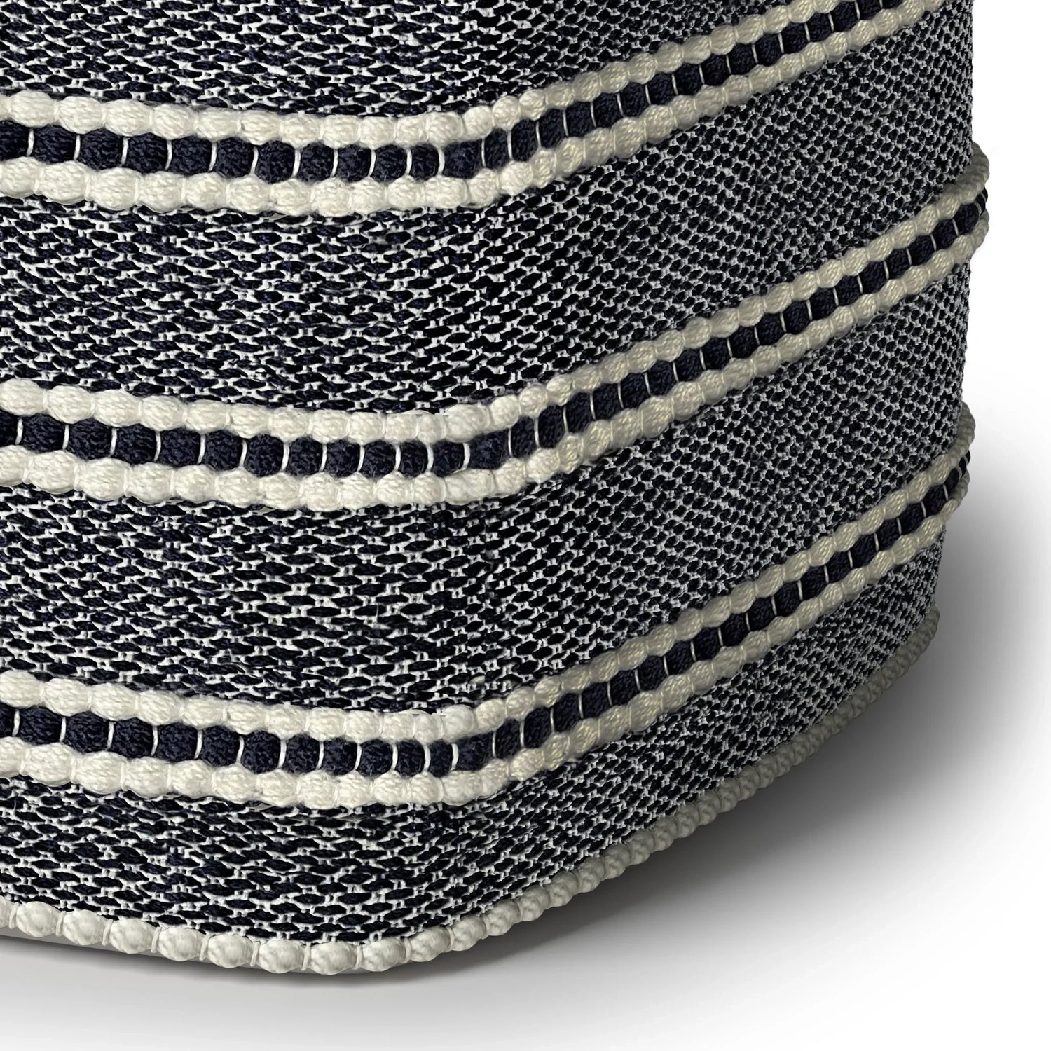 - Handcrafted with woven polyester in a navy and white pattern