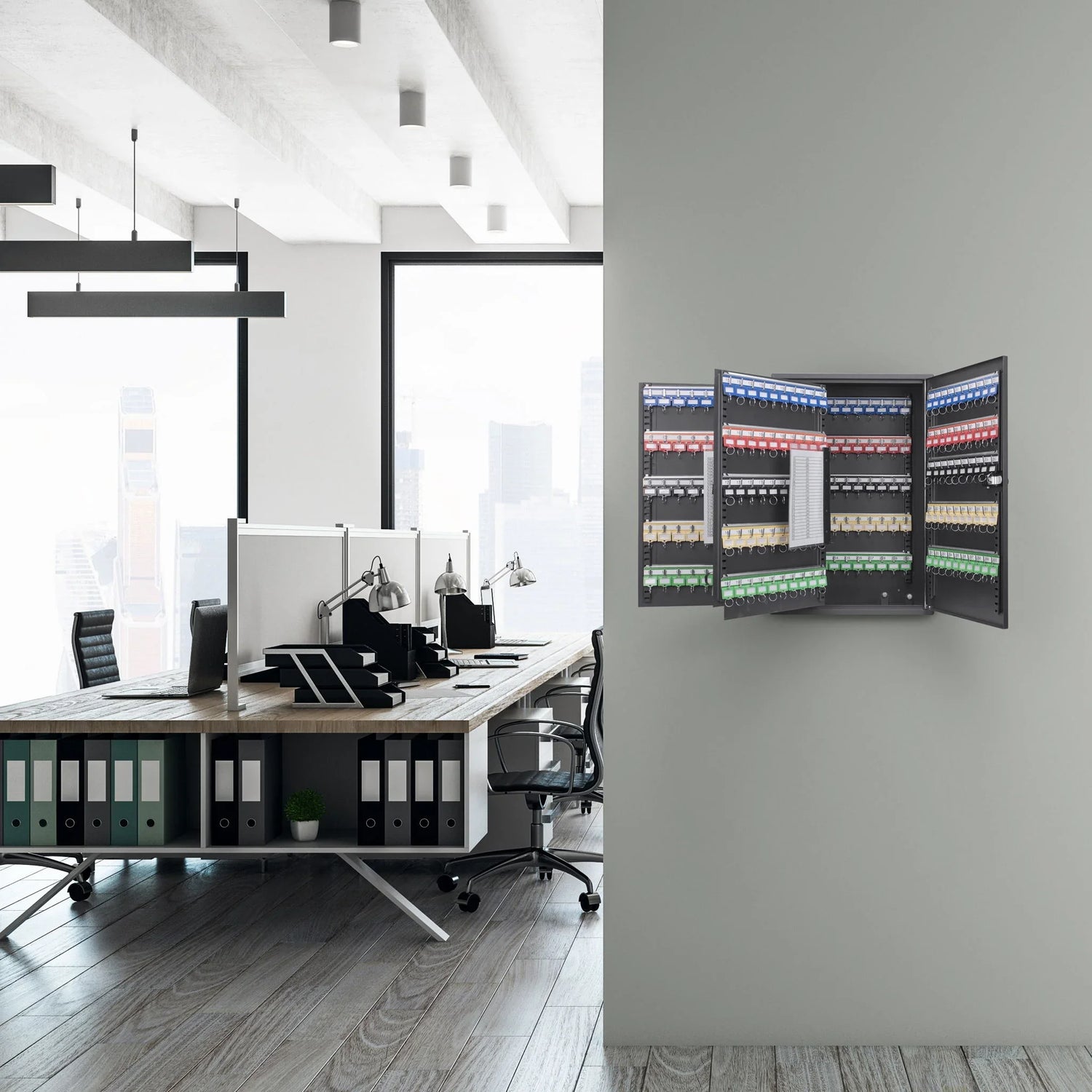 Mount this cabinet at a convenient height near your entryway, reception desk or maintenance zone so the key tags are easily readable. Its compact, vertical footprint works well in narrow corridors or utility closets where desk- or shelf-space is limited.