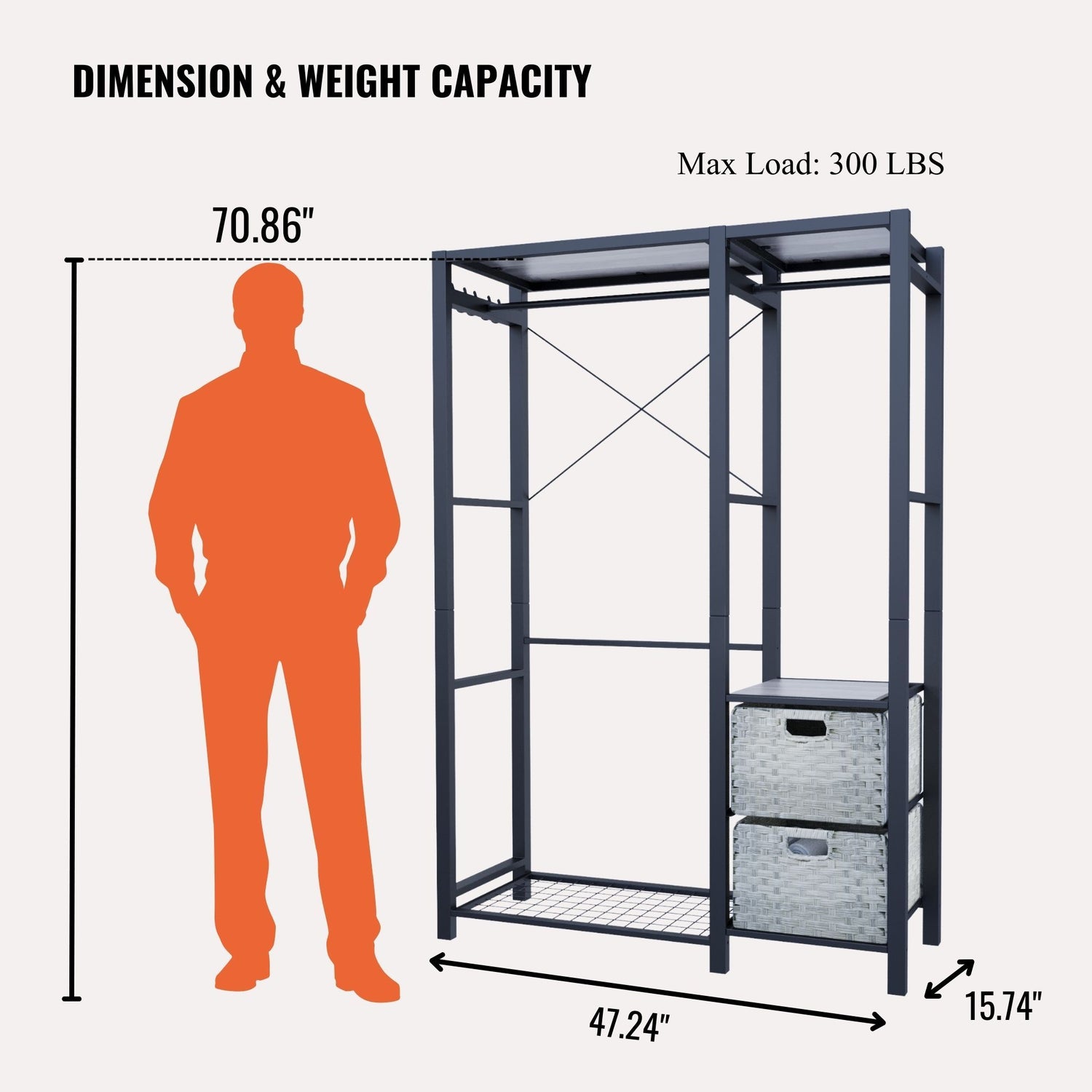 Garment Rack With Shelves, 2 Wicker Drawers, 4 Hooks, Organizer
