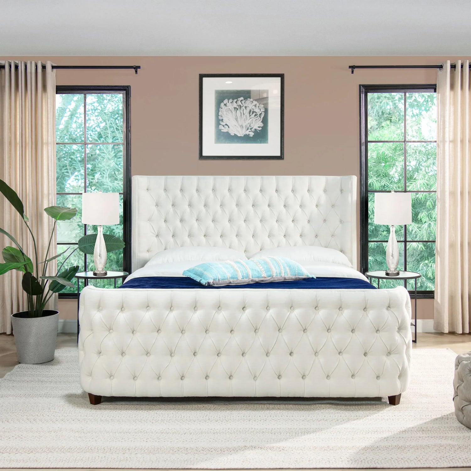 Designed with everyday use in mind, this upholstered bed pairs traditional craftsmanship with modern lines: a shelter‑style headboard for a cozy bedside feel and a fully tufted footboard for balance and visual continuity. The set is upholstered in plush fabric with low, tapered wooden legs and shows the kind of detailing—tufting, welted edges, shelter wings—that elevates a room without complicating maintenance.