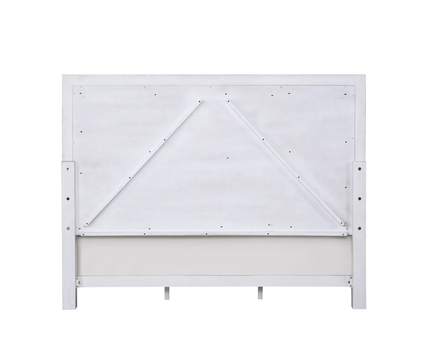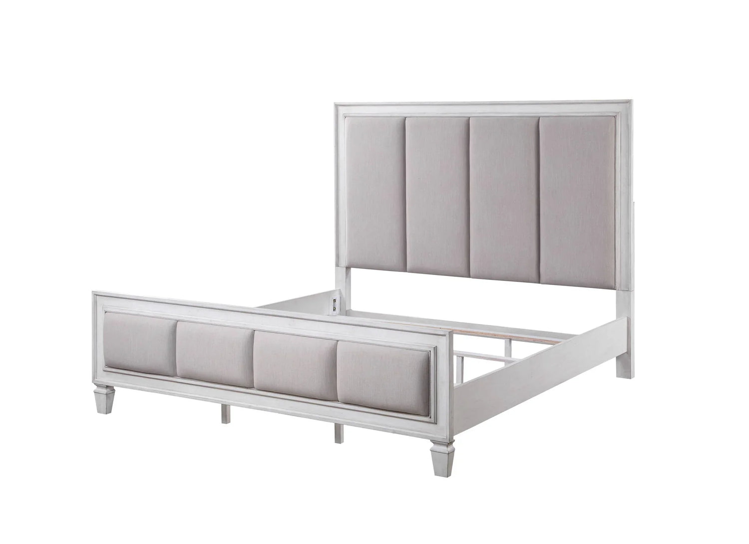 Frame & upholstery: Wood frame with fabric-upholstered headboard and footboard panels. The finish appears as a whitewashed/antiqued white frame paired with light gray fabric upholstery.