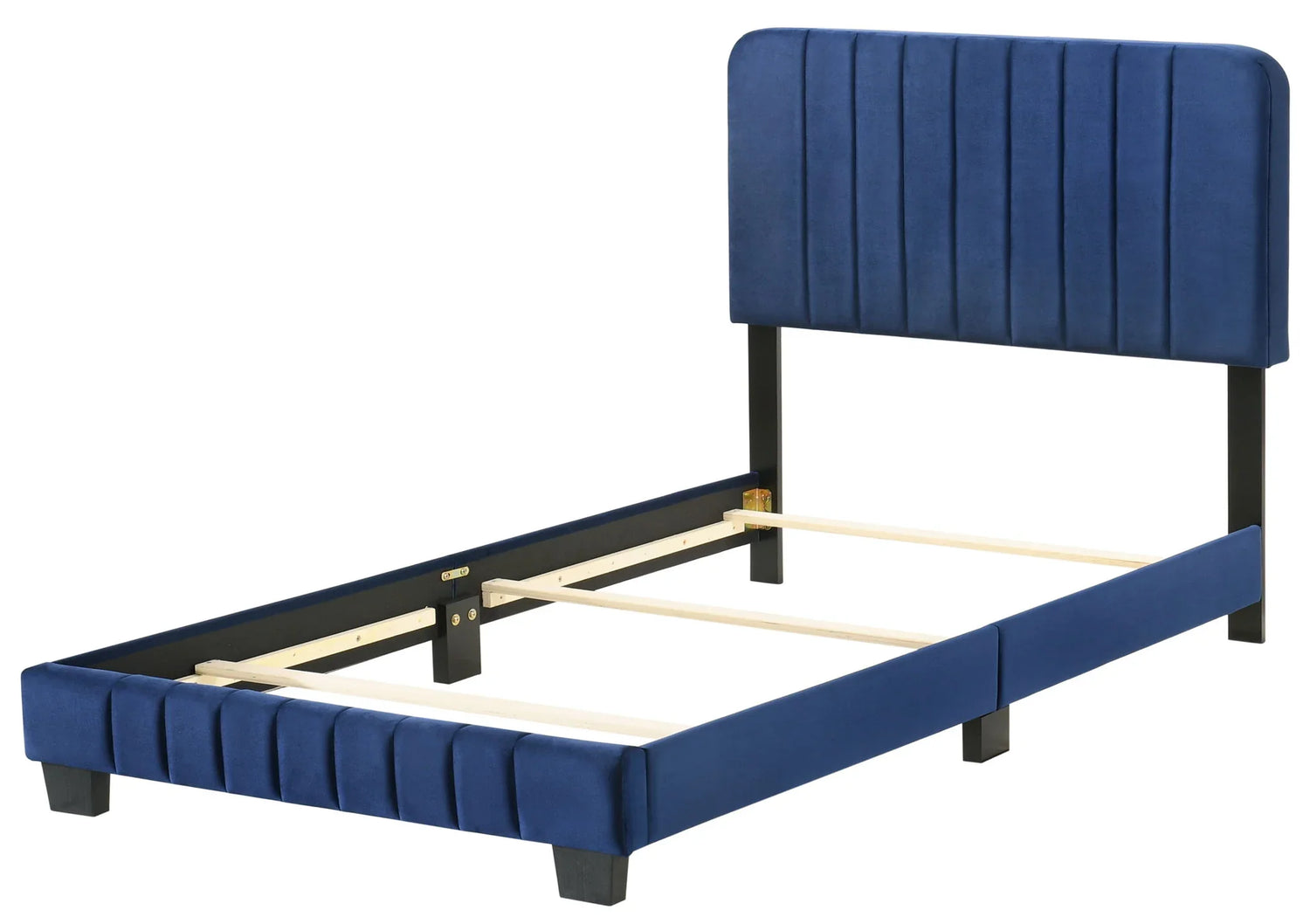 Upholstery: Luxurious velvet with vertical channel tufting visible across the headboard and wrapped base.