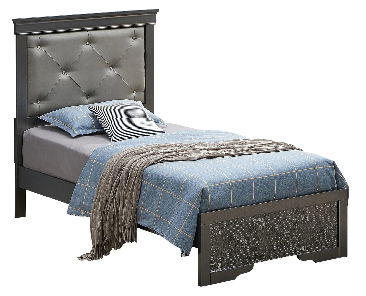 • Footboard & frame finish: Silver champagne textured "croc" pattern on footboard and panel inserts; wood-frame construction with laminate/veneer surfaces.