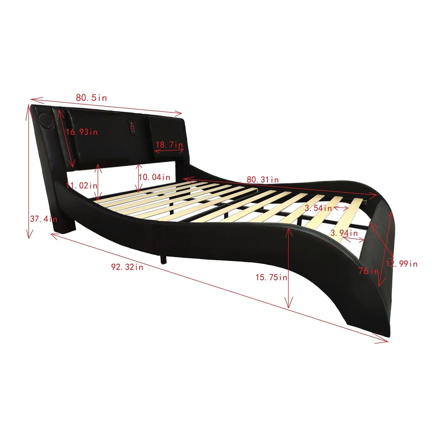 Upholstered Platform Bed Frame With LED Lighting, Bluetooth Connection To Play Music Control, Backrest Vibration Massage, Curve Design, Wood Slat Support, Exhibited Speakers