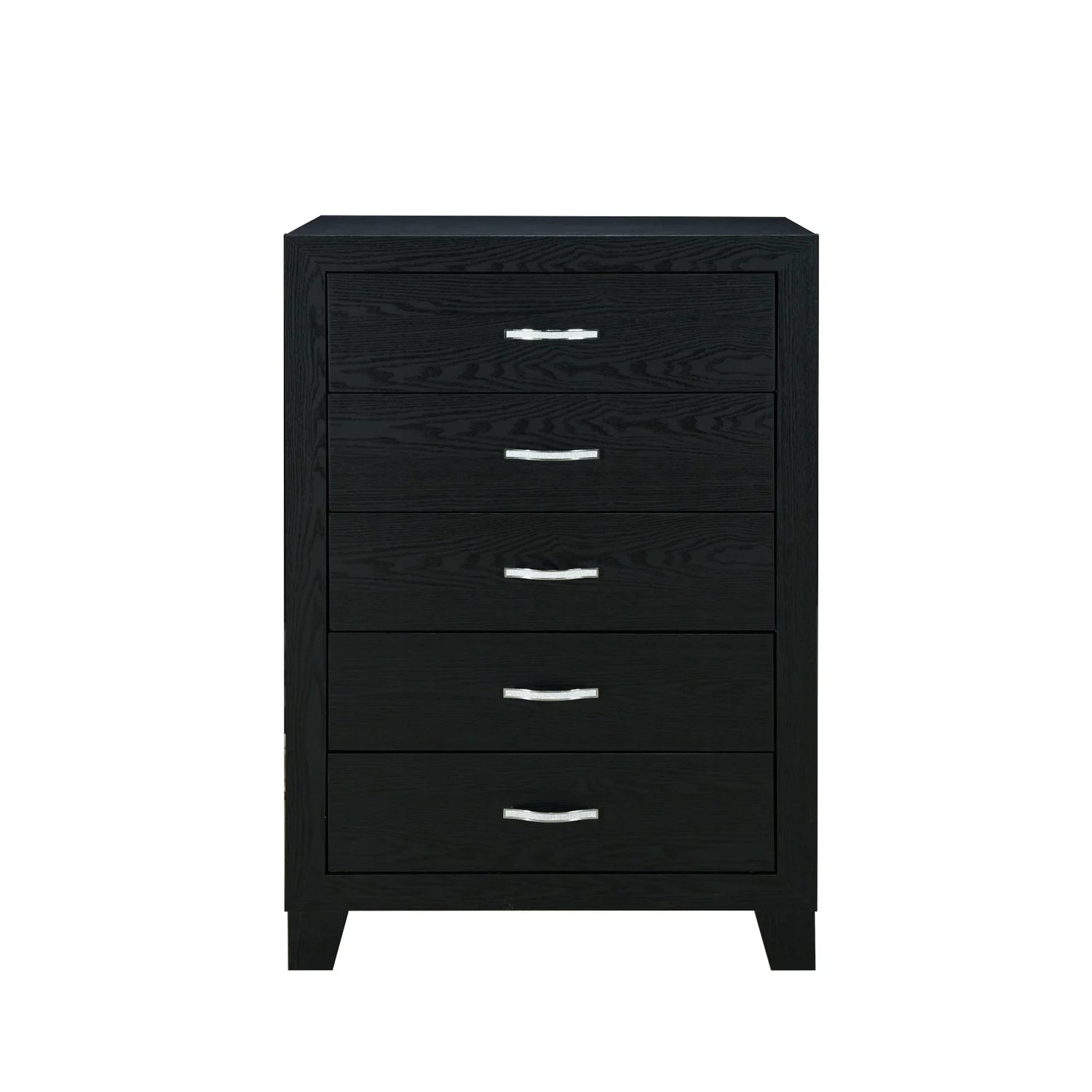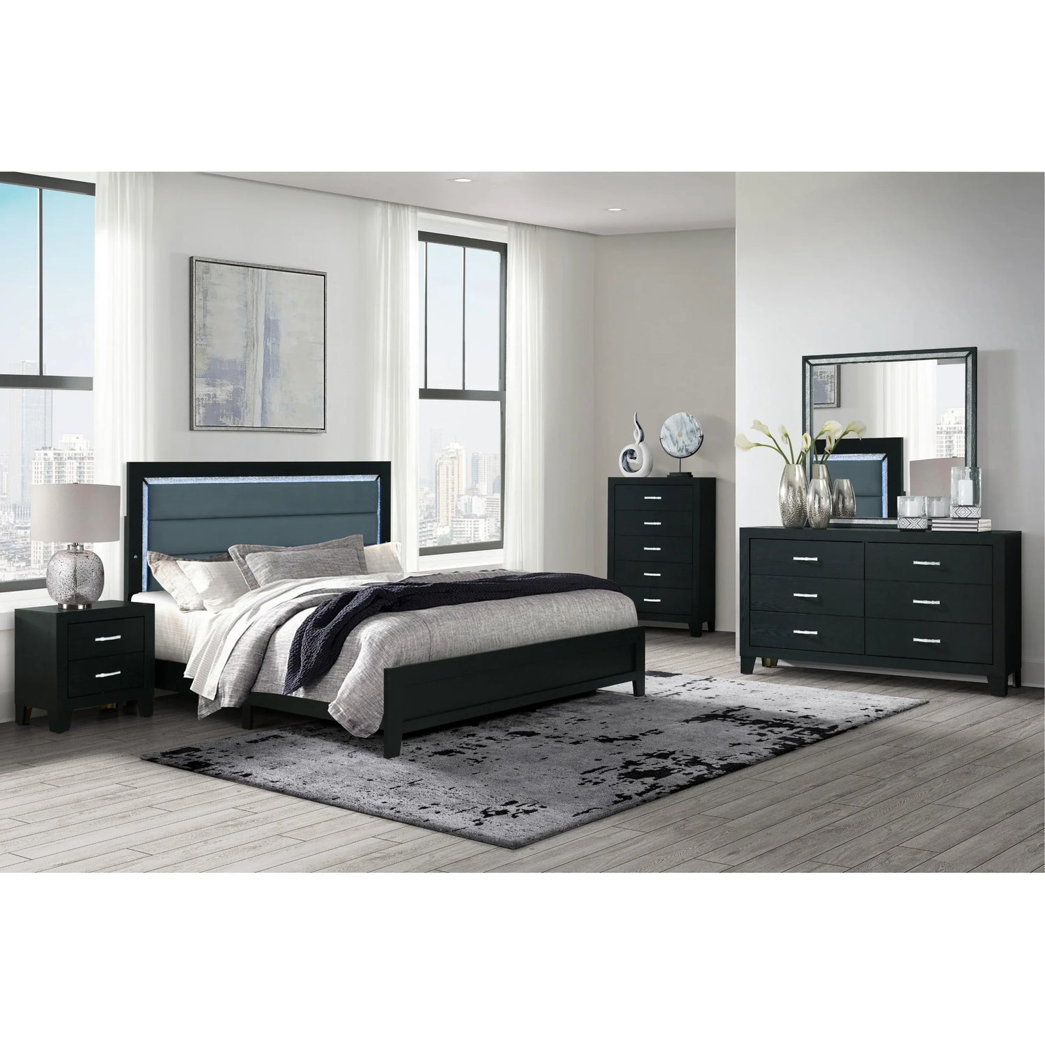 This contemporary 5-piece bedroom set is designed for anyone who wants a cohesive, modern look with practical storage and a striking focal point. Ideal for a master bedroom or a large guest suite, the set brings a clean black finish and streamlined silhouettes that fit contemporary, urban, or minimalist interiors. The included bed, dresser with mirror, chest, and nightstand create a coordinated suite that simplifies styling and makes everyday living feel put-together.