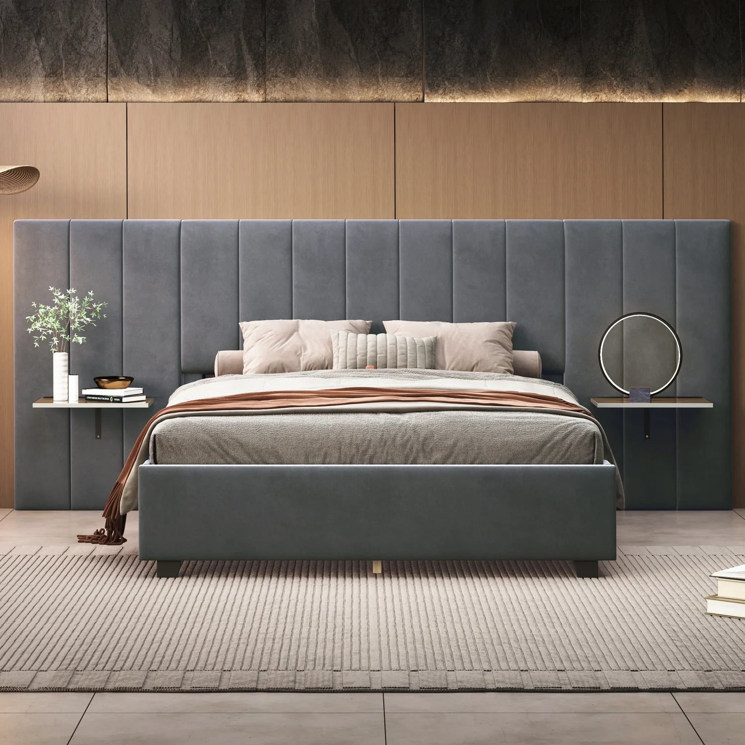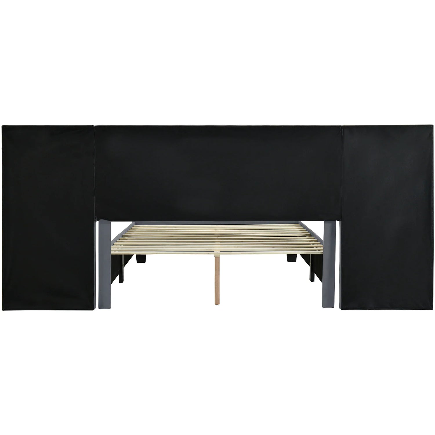 Enjoy ultimate comfort with the oversized and ultra-soft headboard, which provides a cozy, relaxing backdrop. Additionally, the integrated shelves on both sides of the headboard offer convenient storage for your bedside essentials, keeping them within easy reach.With its sleek and contemporary design, this bed blends style and functionality, creating a tranquil and inviting atmosphere where you can unwind and rejuvenate comfortably.