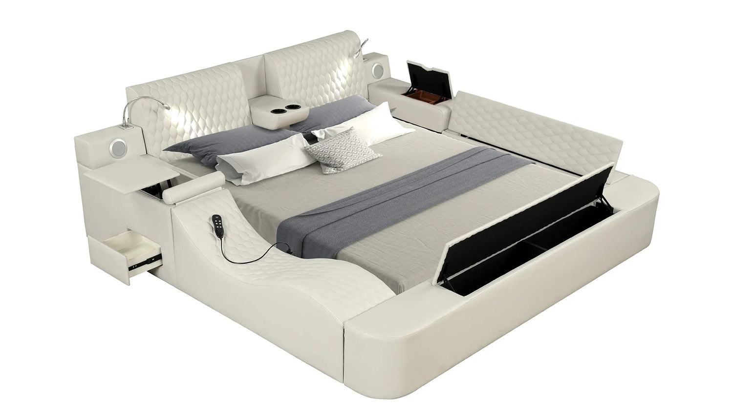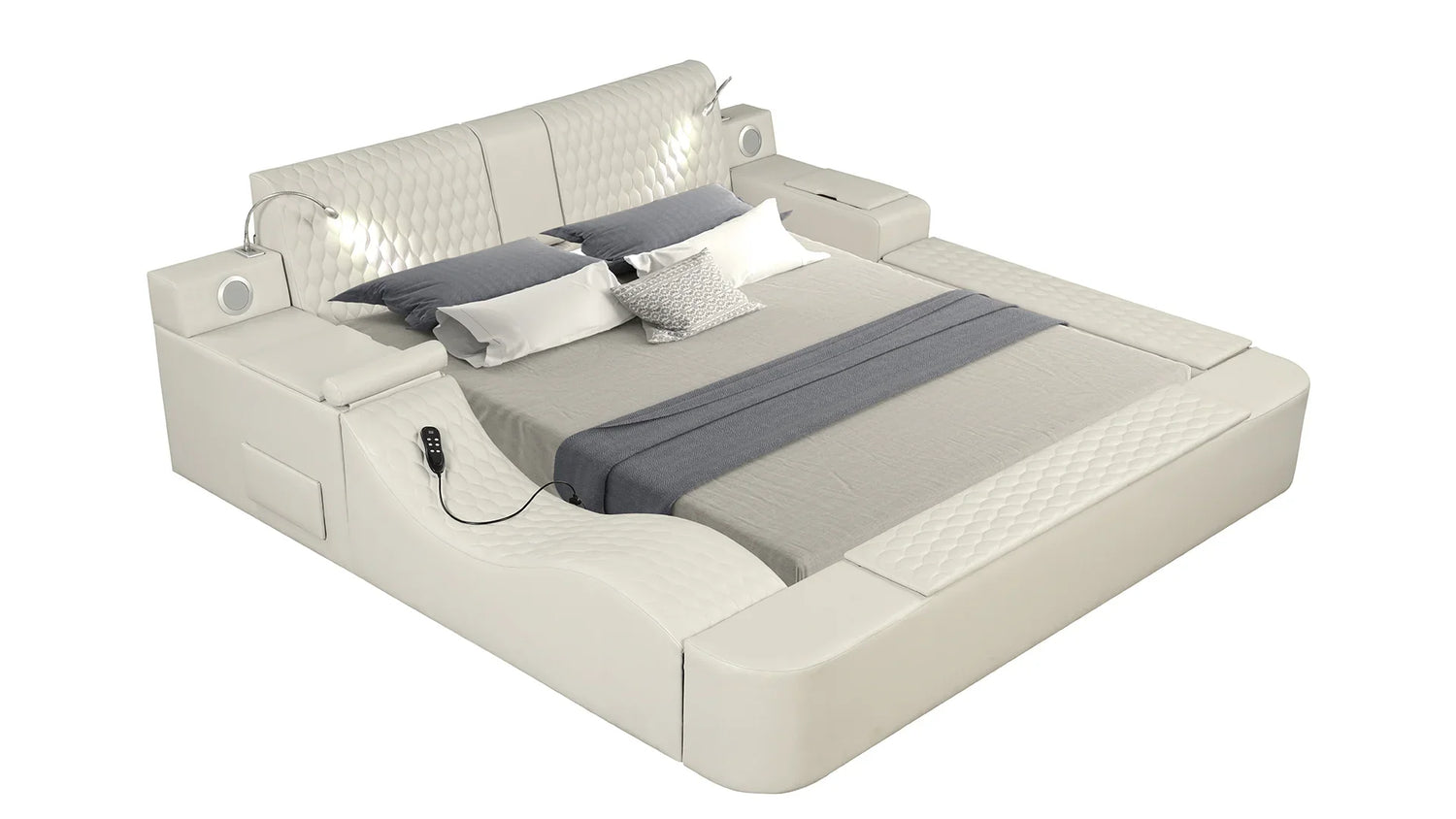 • Built-in features: Integrated ambient/headboard lighting and dual reading lights, built-in speakers and bedside storage pockets (as shown in imagery). Remote/hand control visible in product imagery likely operates integrated functions.