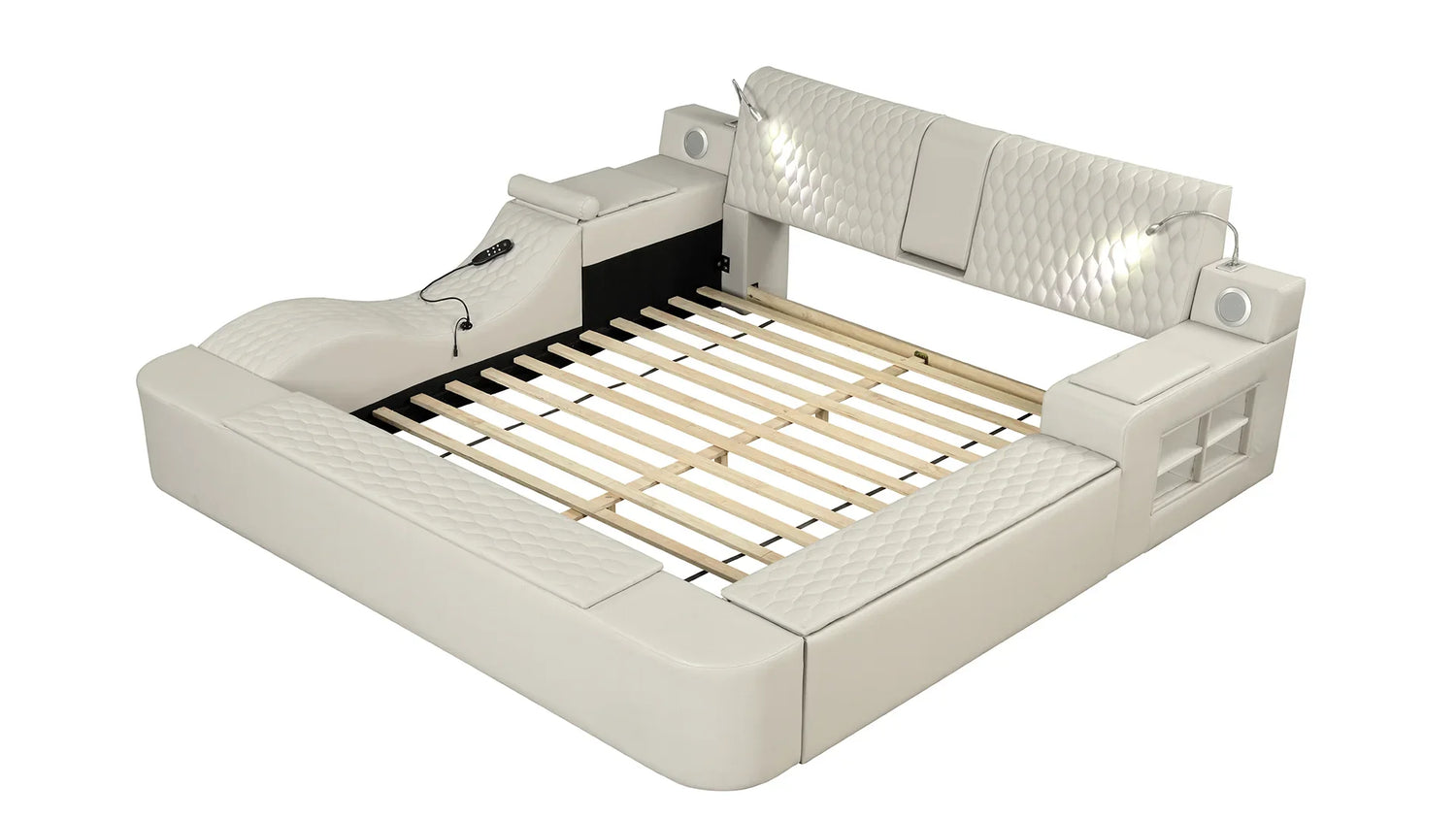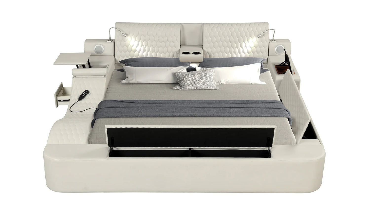 Everyday ease is built in: the engineered wood frame is wrapped in beige faux leather with diamond-quilted padding on the headboard and chaise-like side panels for cushioned support. Integrated reading lights and ambient lighting, built-in speakers and bedside storage elements make this bed a modern all-in-one bedroom solution that streamlines nighttime routines and keeps essentials within reach.