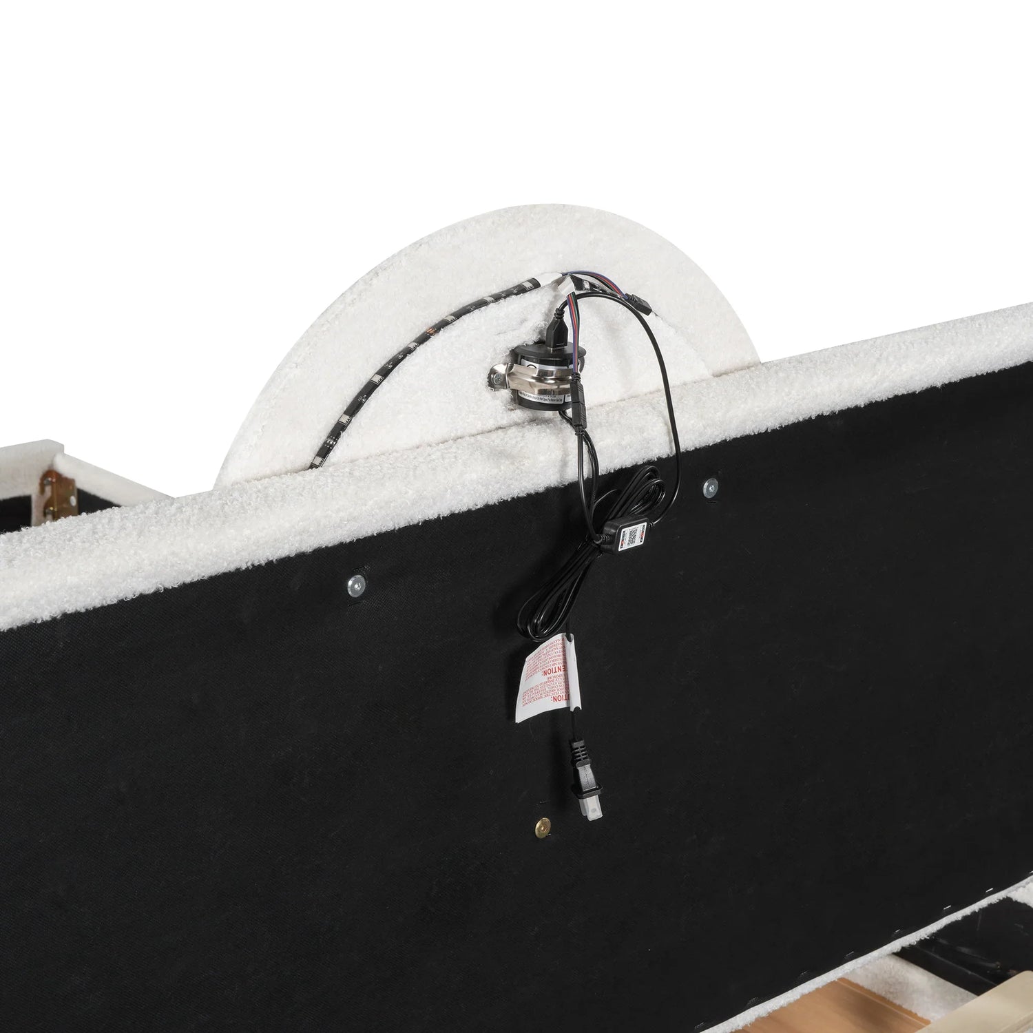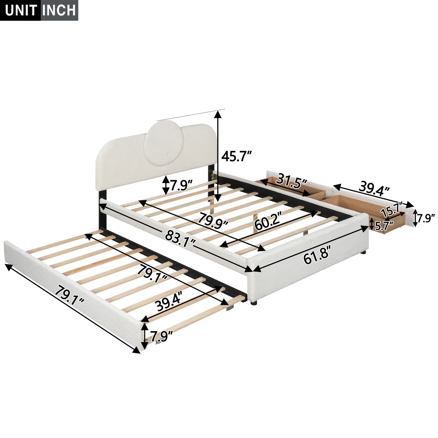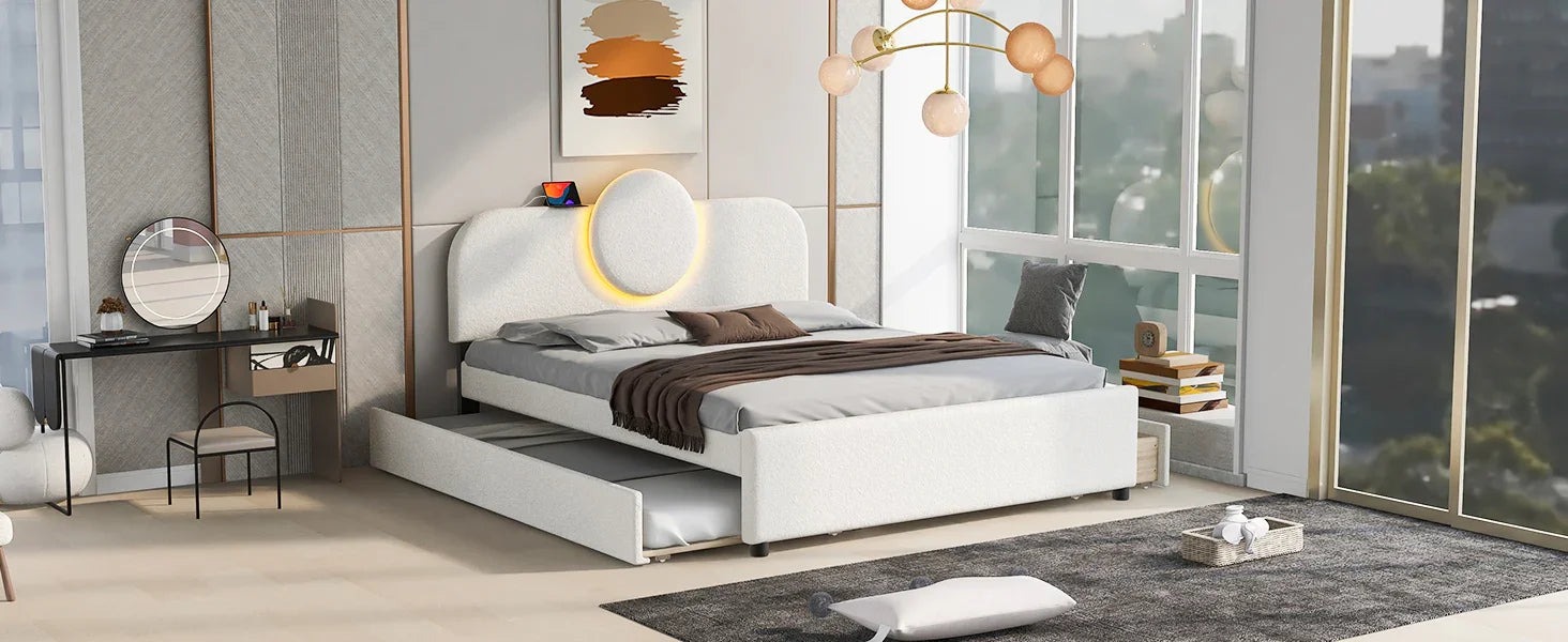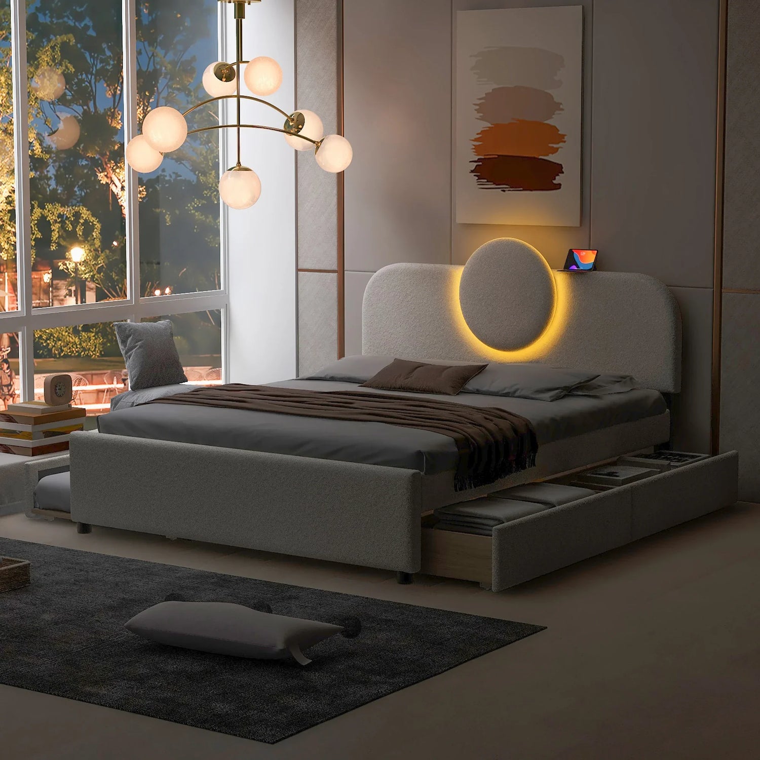 This upholstered platform bed combines style and functionality with its low-profile silhouette and clean lines, making it a versatile addition to any bedroom decor. The headboard features a unique circular decoration and is equipped with LED lighting and dual USB ports on the back, allowing you to light up the room and charge devices simultaneously. Two spacious drawers provide ample storage for essentials like bed sheets, accessories, or seasonal clothing. Additionally, the trundle offers convenient extra sleeping space, perfect for accommodating guests or overnight sleepers.
