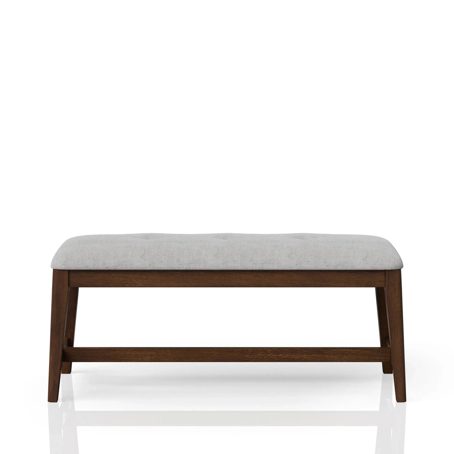 Built for daily use, the bench pairs easily with a narrow dining table, console, or at the foot of a bed. The upholstery is a light beige fabric with soft, warm undertones set over a slightly tufted cushion, and the tapered, dark‑brown wooden legs and stretcher provide stable support and classic mid‑century lines. Screens and natural wood grain may show small color and texture variations.