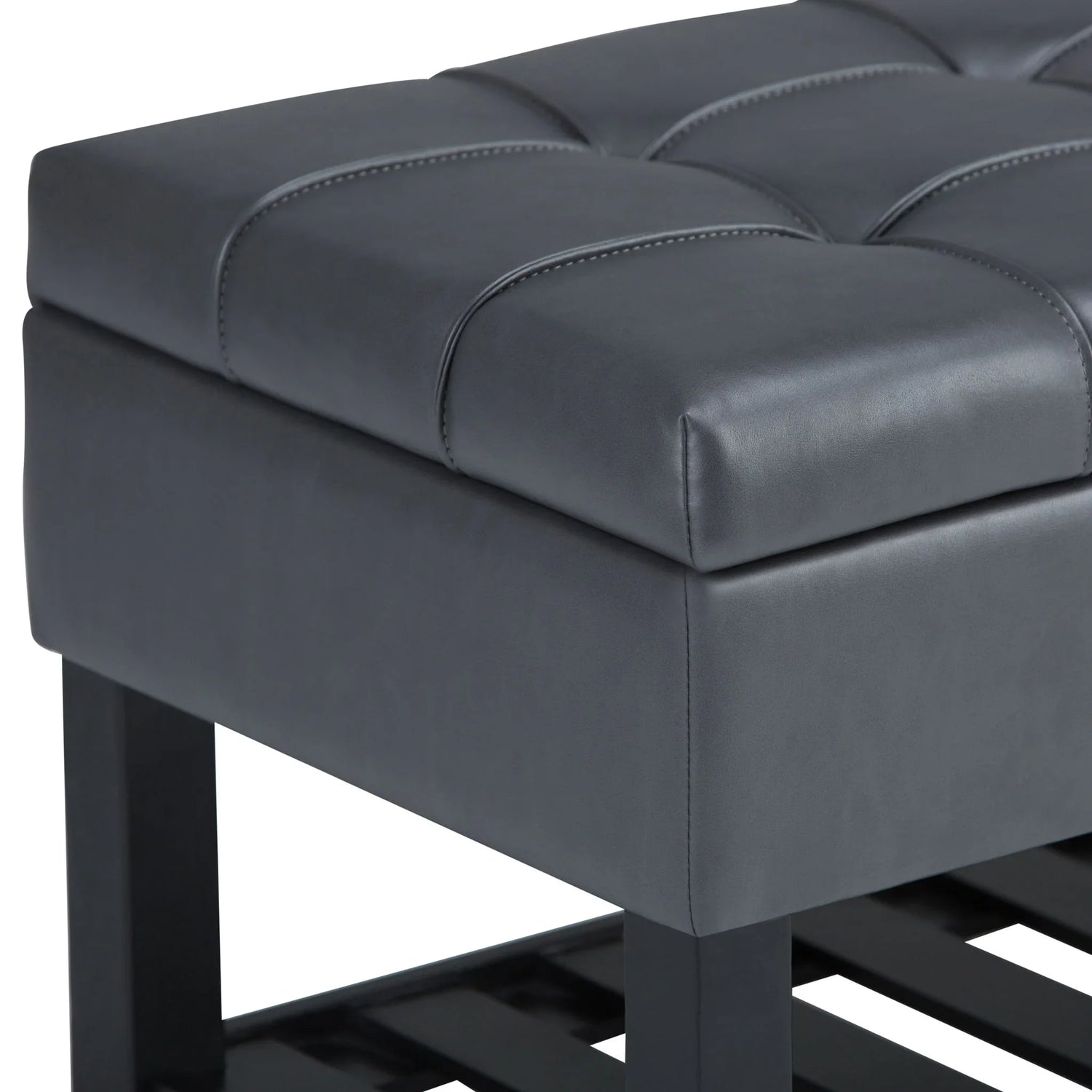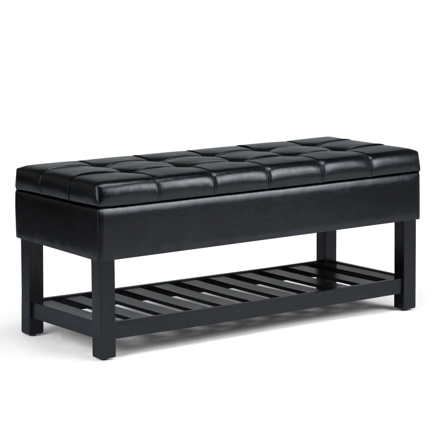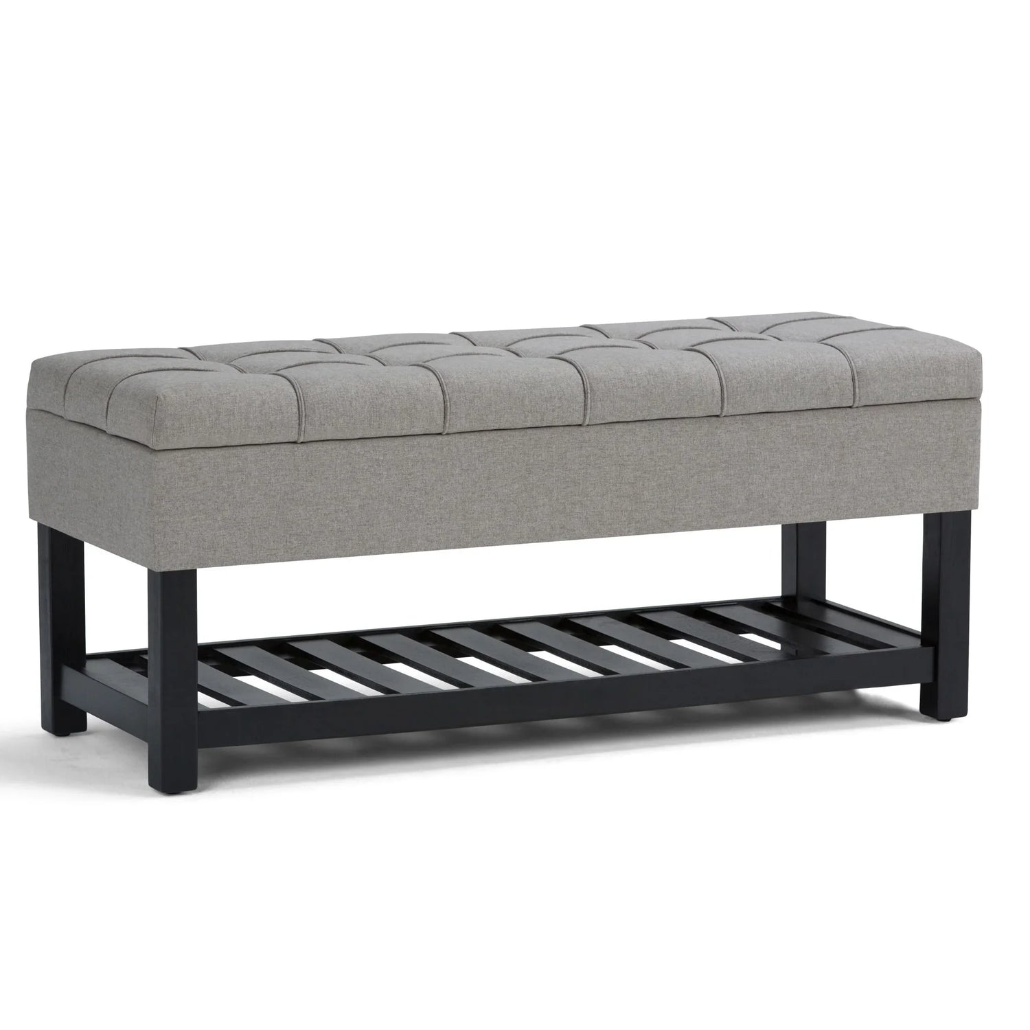 The Saxon Upholstered Transitional Storage Ottoman Bench is for shoppers who want tidy, multi‑use seating with a polished, modern profile. Sized to sit at the end of a bed, anchor an entryway, or add extra seating in a living room, it pairs a tufted upholstered top with a roomy lift‑up compartment and an open slatted shelf underneath for shoes, baskets, or blankets. The look reads transitional—clean lines with stitched tufting—so it works with contemporary, mid‑century and classic interiors.