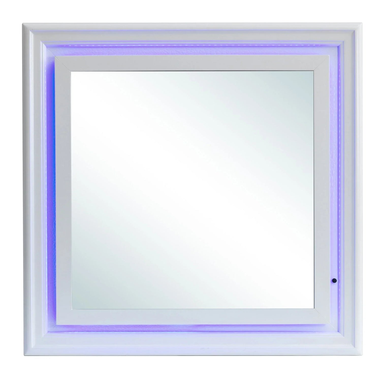 Perfect for a modern bedroom, dressing area, or entryway, this Elegant Transitional LED Mirror brings practical lighting and a designer look to everyday routines. The square framed mirror pairs low-distortion glass with a wood veneer frame finished in a textured "Croc" pattern, creating a focal point that lifts neutral and contemporary interiors alike. The built-in LED accent produces a soft halo (shown here in blue) that brightens grooming, styling, and ambient lighting tasks without needing additional fixtures.