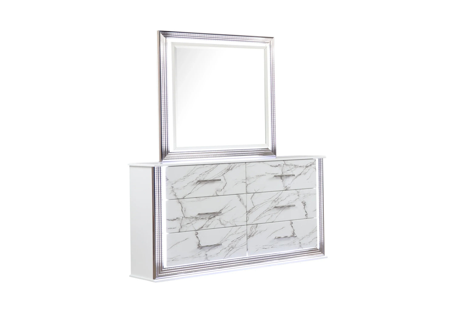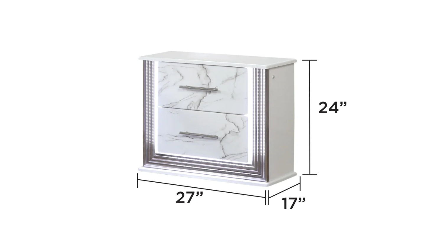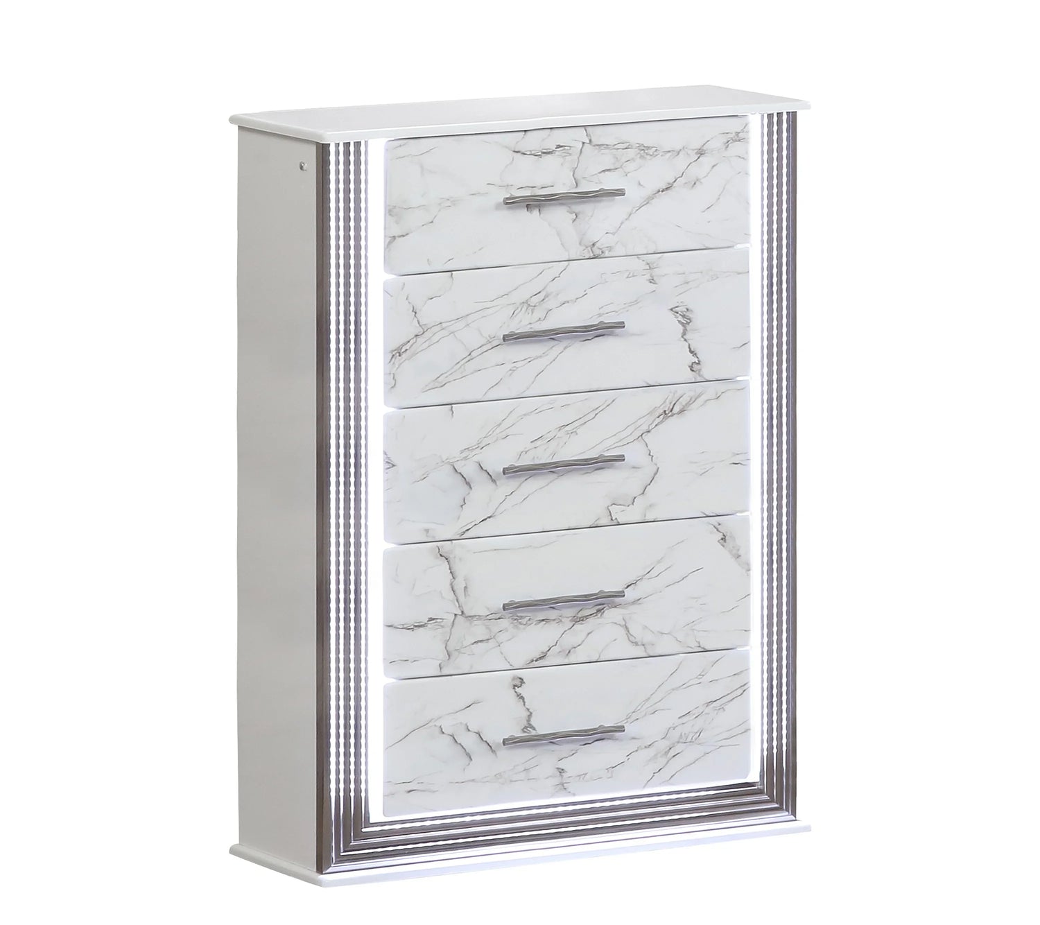 Every piece is crafted from solid wood plus MDF and finished in a glossy white marble pattern with chrome‑tone trim; the headboard features vertical channel upholstery and integrated LED lighting that creates a warm, ambient glow. The complete 5‑piece arrangement (bed, chest, dresser, mirror, nightstand) gives you coordinated storage and styling so you can furnish a bedroom quickly and confidently.