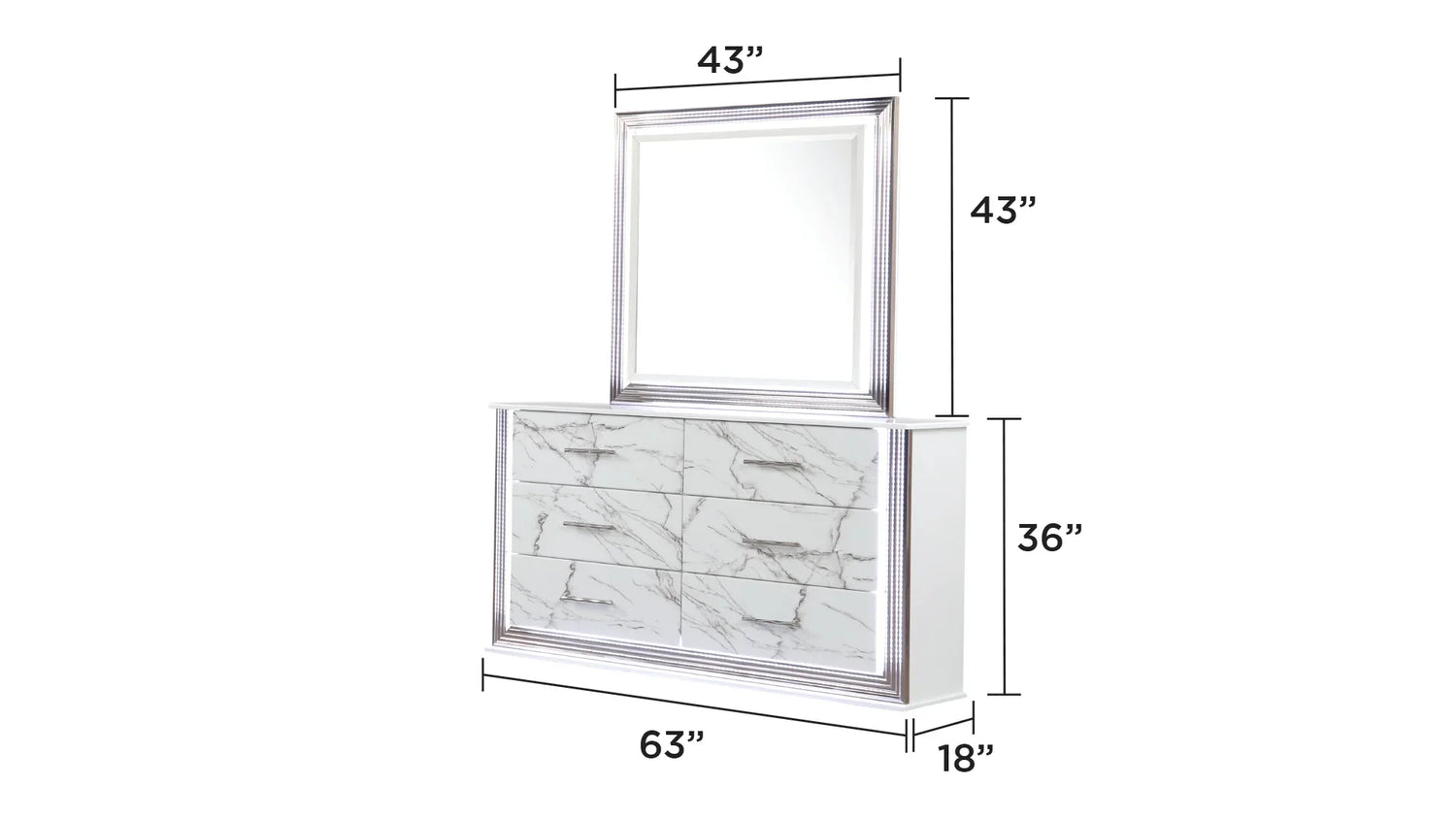 Construction highlights: Sturdy wood/MDF casegoods with framed drawer fronts and metal hardware; dresser includes matching framed mirror.