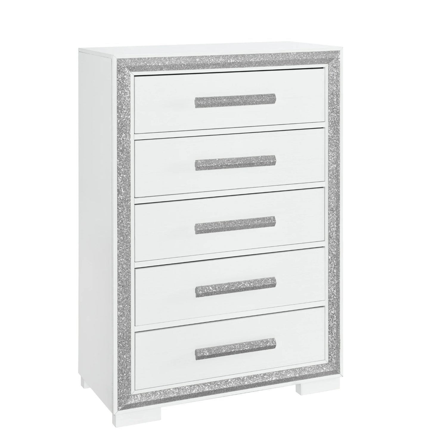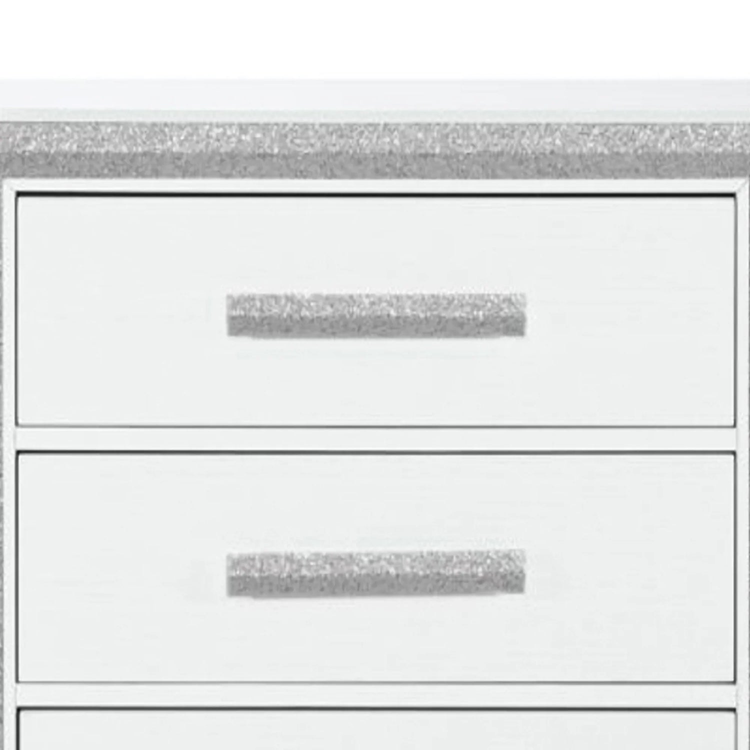 Built from rubberwood with a cool pearl‑silver finish and polyester‑upholstered headboard, this set balances durable construction with soft, tactile comfort. Visual details include a paneled upholstered headboard in deep gray, glossy silver trim around drawer faces and frame edges, and a crisp light-gray body tone that contrasts nicely with darker linens. The design reads contemporary and curated—easy to style with both warm and cool palettes.