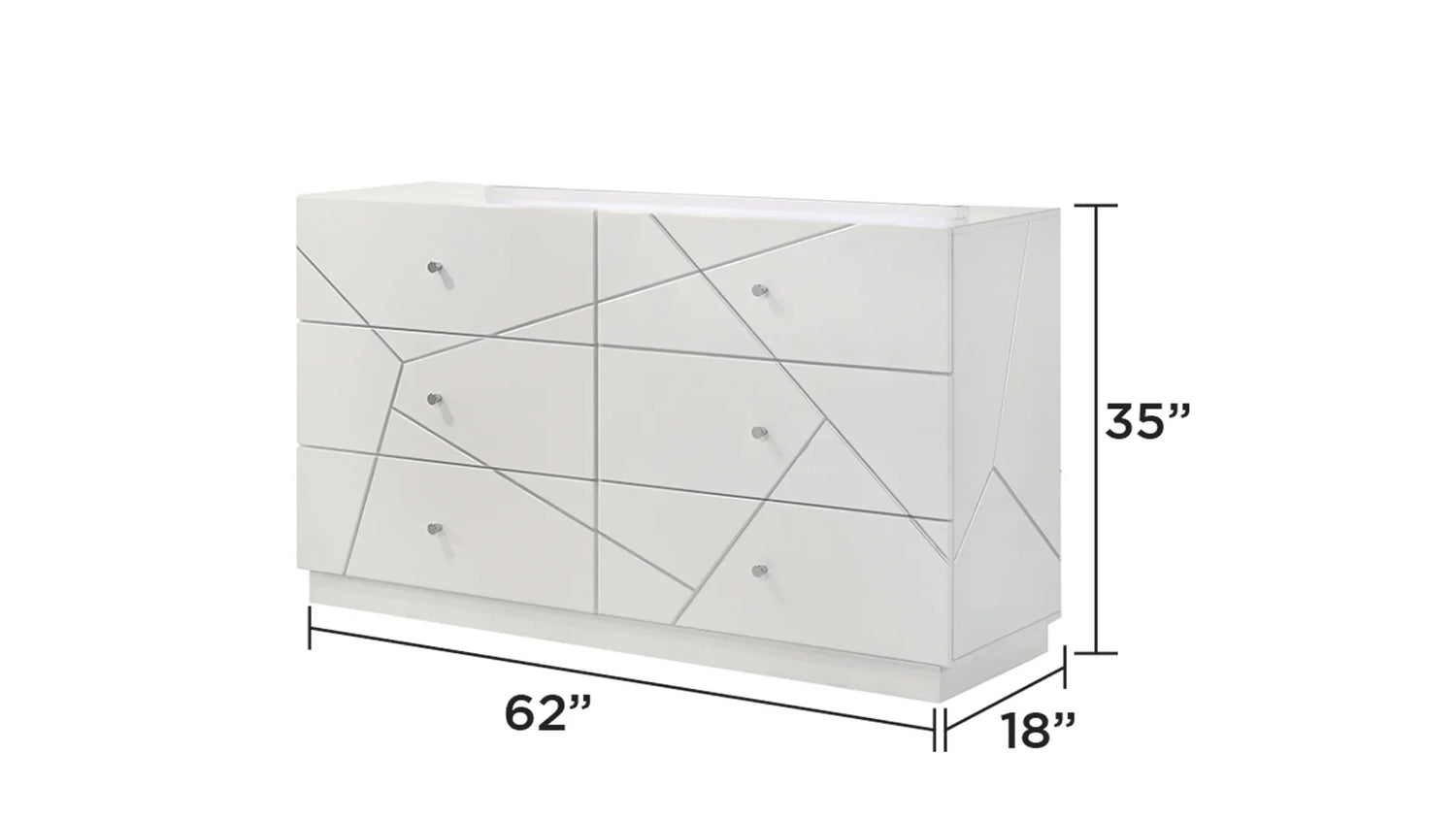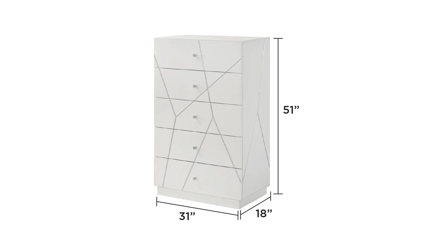 Clean, contemporary and made for everyday living, this five-piece bedroom set brings modern geometric style and practical storage to the center of your home. Designed for a queen mattress, the set suits anyone looking to refresh a master or guest bedroom with bright, high-gloss white surfaces, subtle angular inlays and a calming, architecture-inspired silhouette. The visual language is minimalist but warm—perfect for modern, Scandinavian, or transitional rooms that need a crisp focal point.