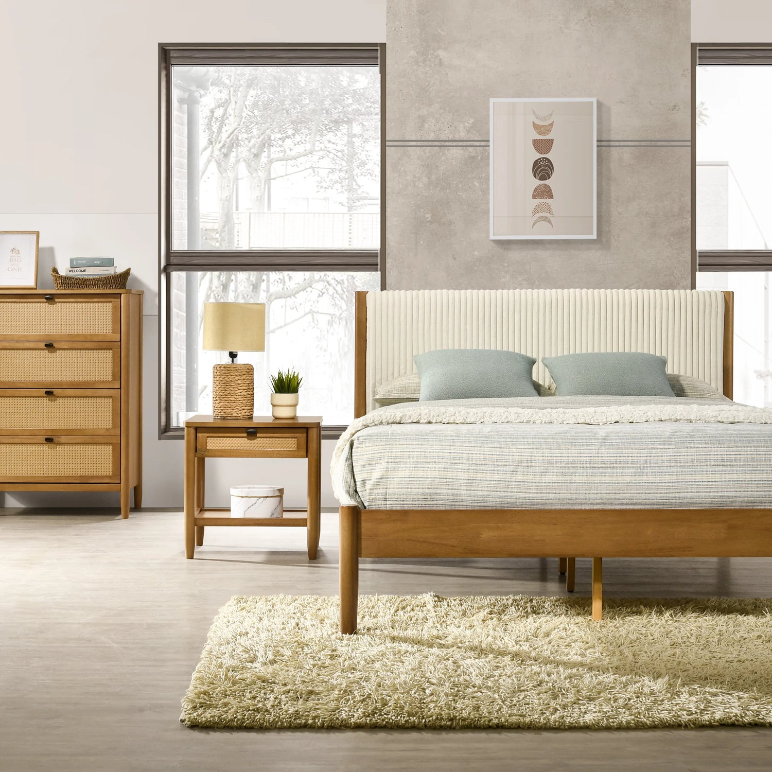 Every piece is finished in a walnut tone and combined with corduroy upholstery and rubberwood accents for a modern yet approachable aesthetic. The ribbed corduroy headboard adds soft visual interest and everyday comfort, while the solid rubberwood construction visible in the case pieces keeps the collection feeling grounded and durable.