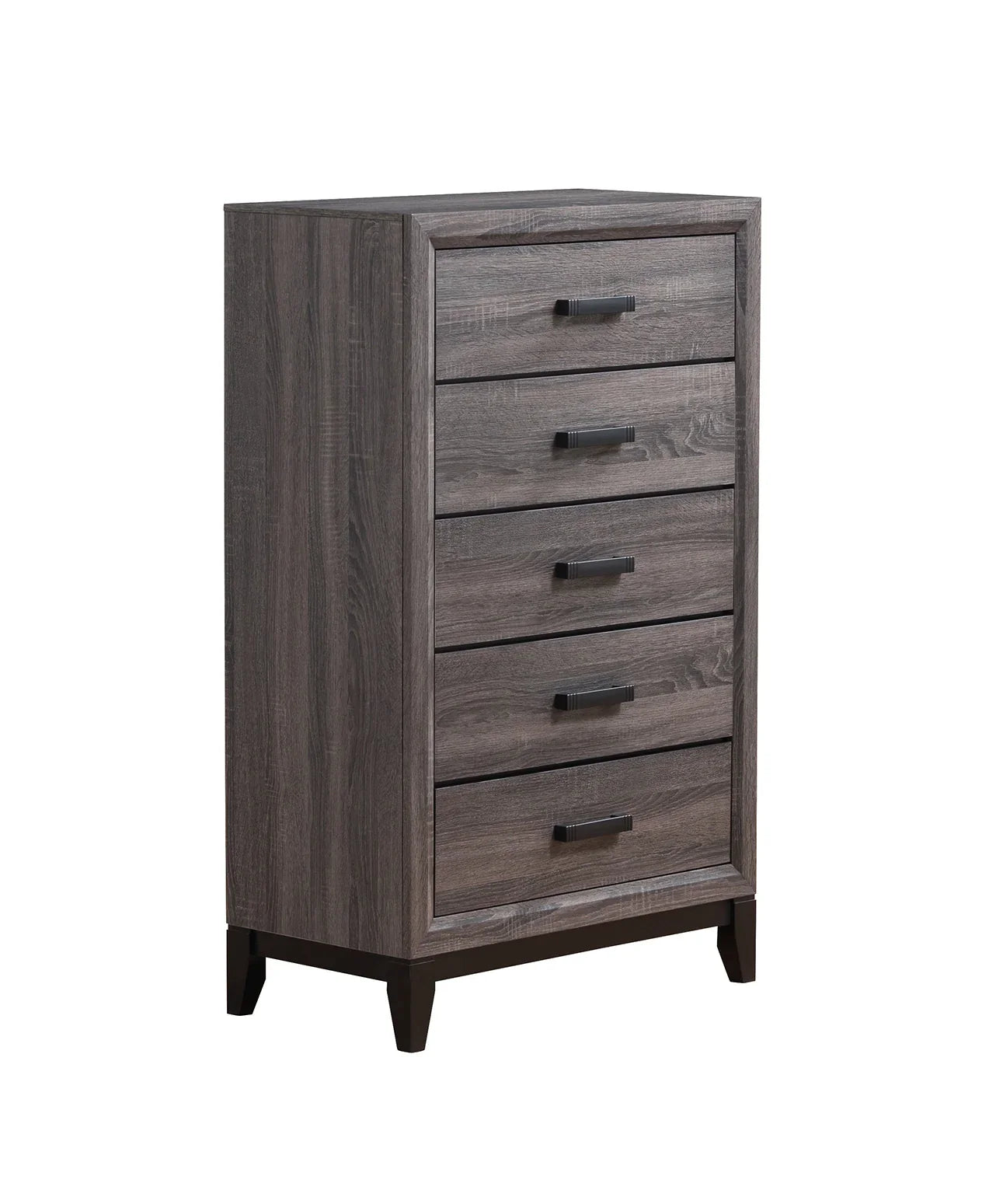 Built from rubberwood and engineered filler, the collection features a weathered gray wood tone with subtle black undertones and matte finish accents that read contemporary without feeling cold. The low-profile bed needs a box spring and presents a horizontal paneled headboard and framed footboard for a streamlined silhouette that layers easily with a variety of bedding styles.