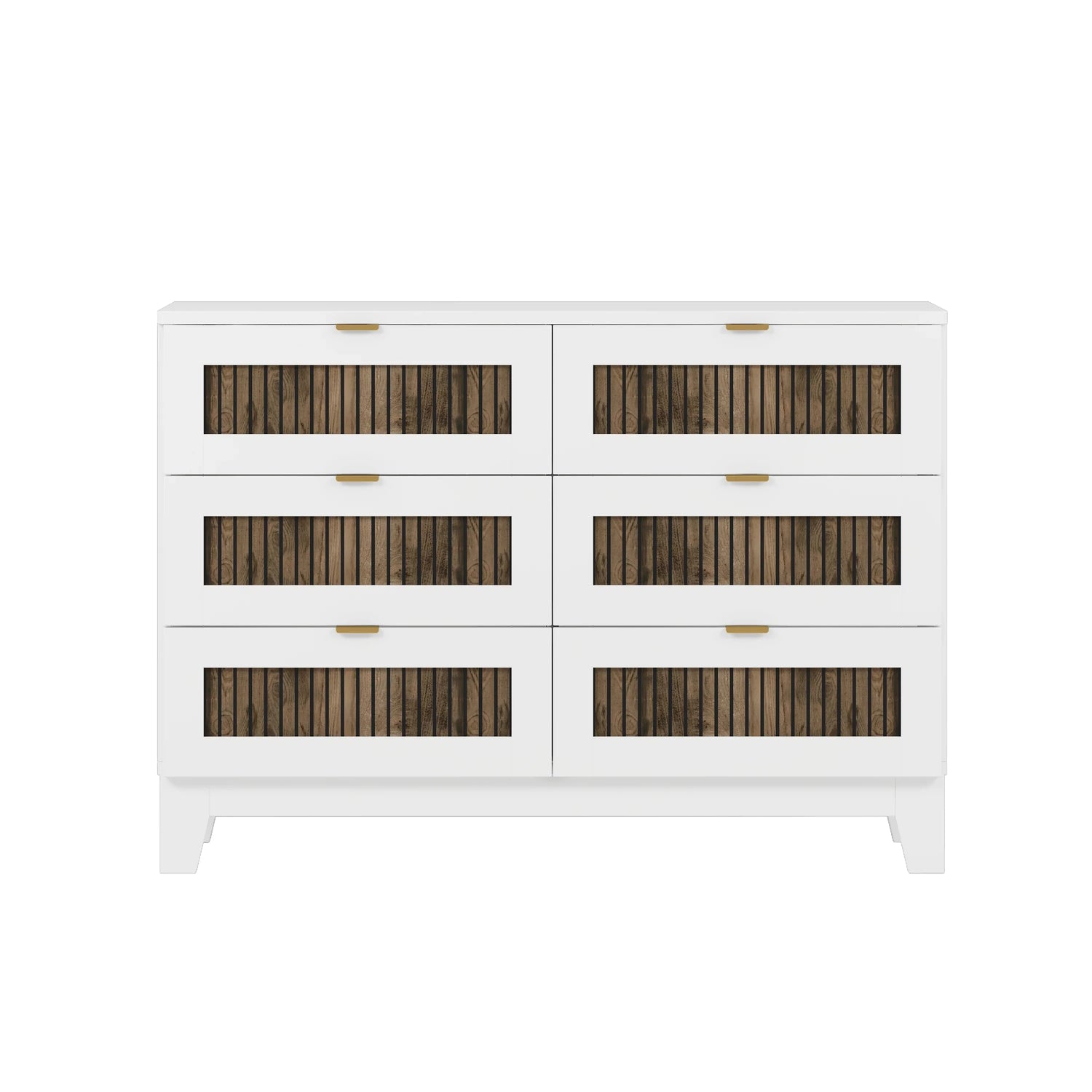 - Finish & hardware: Matte white painted frame with warm wood-tone vertical slat inserts and warm metallic drawer pulls (as shown in photos).